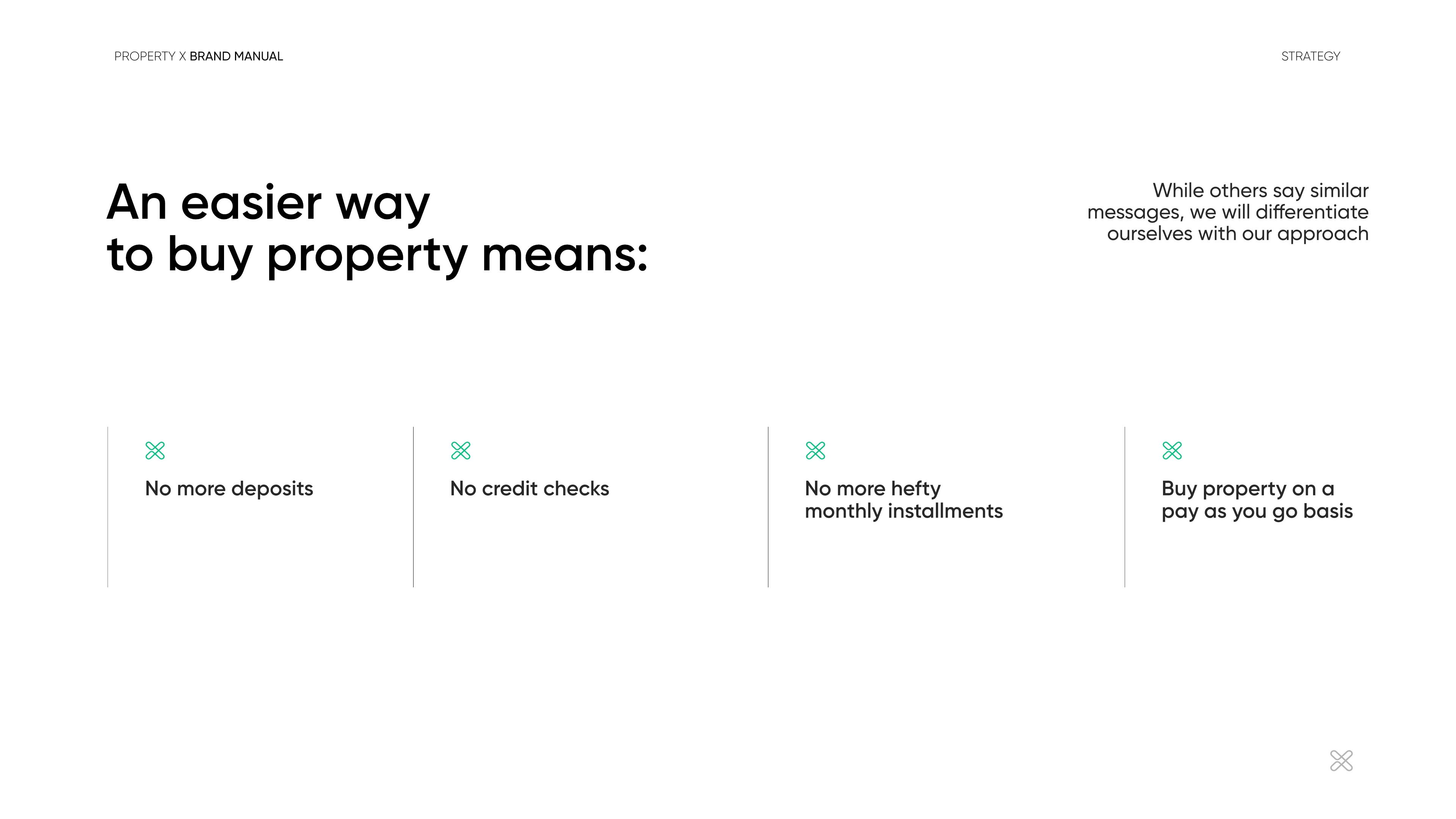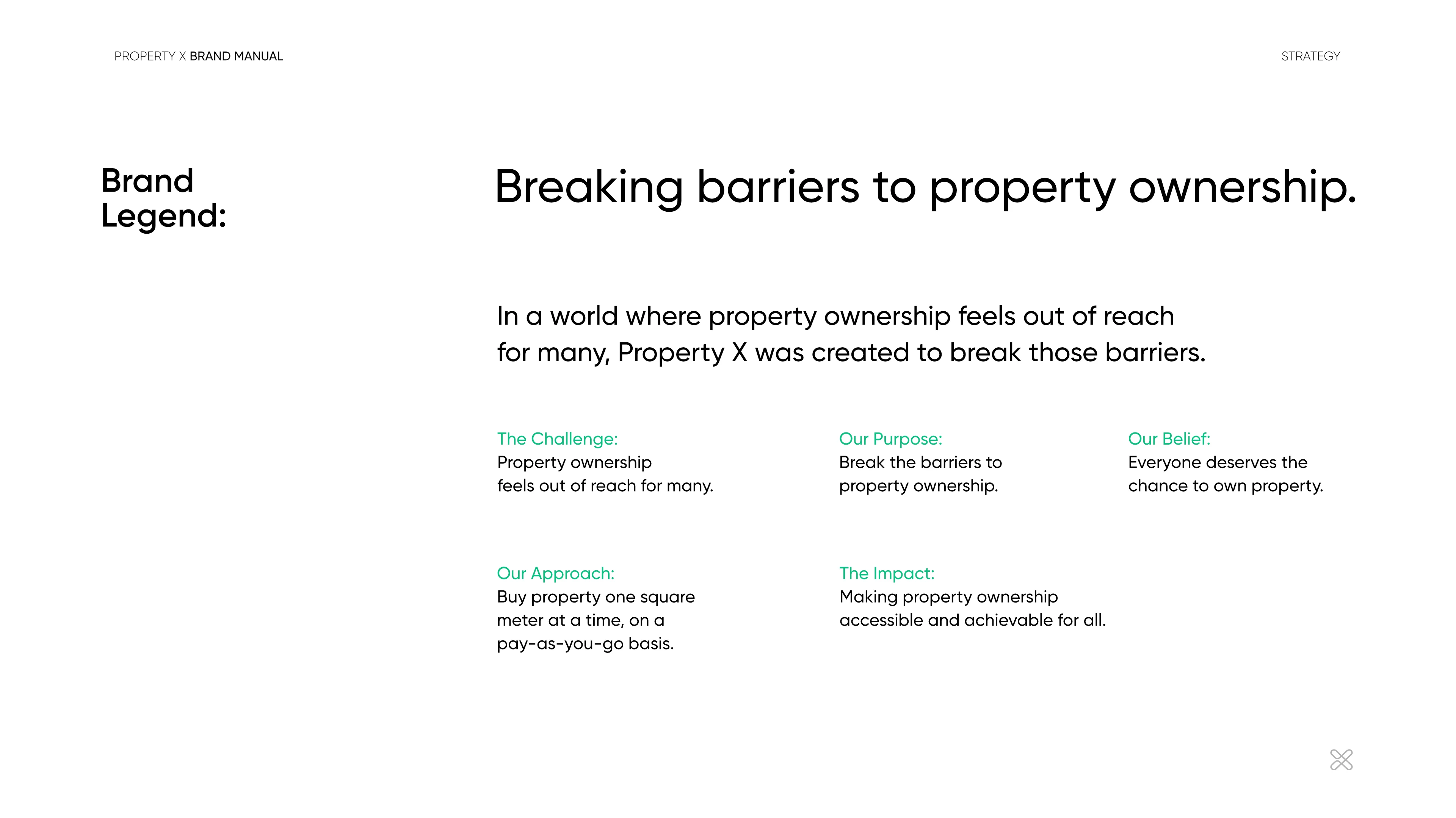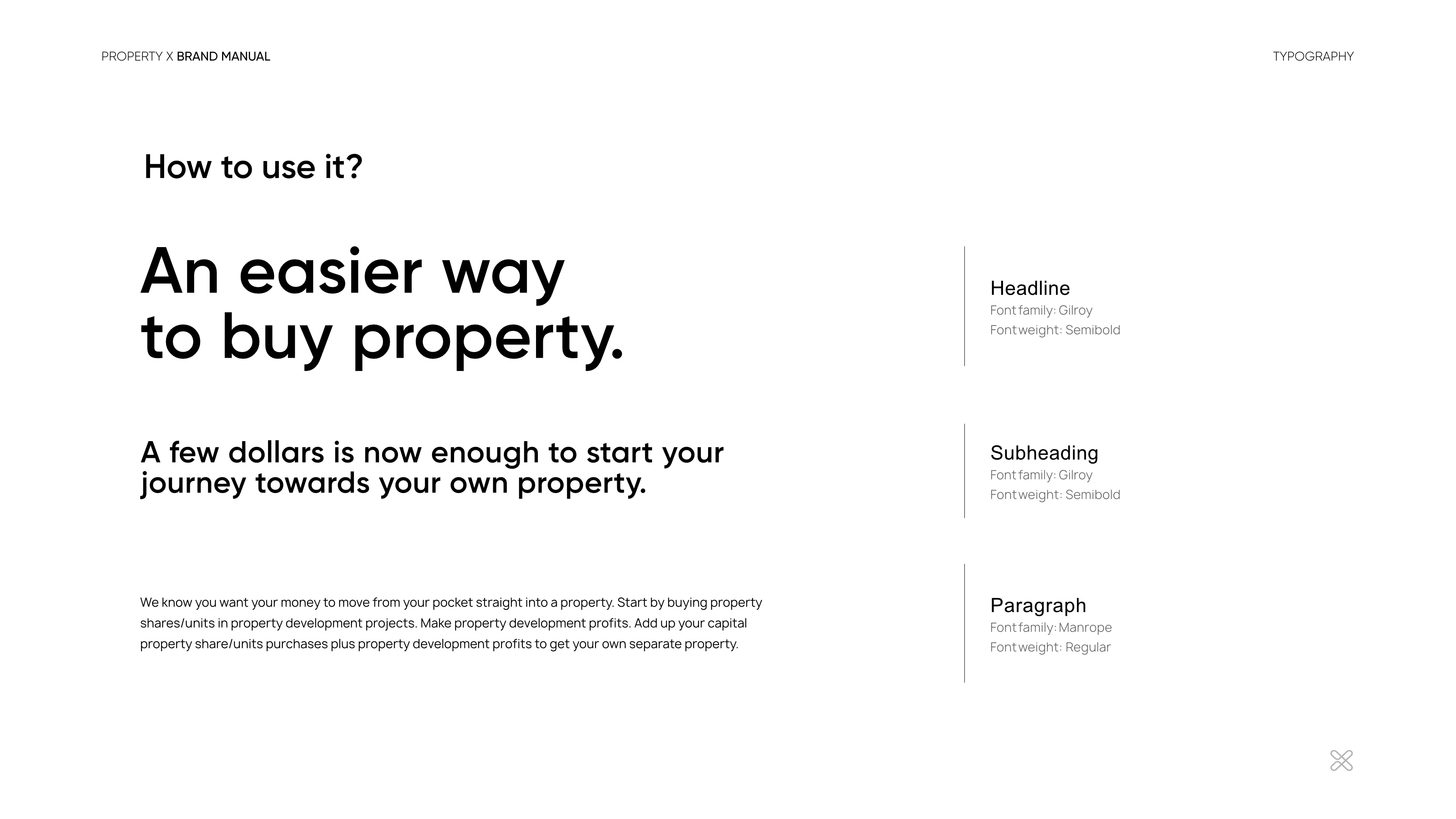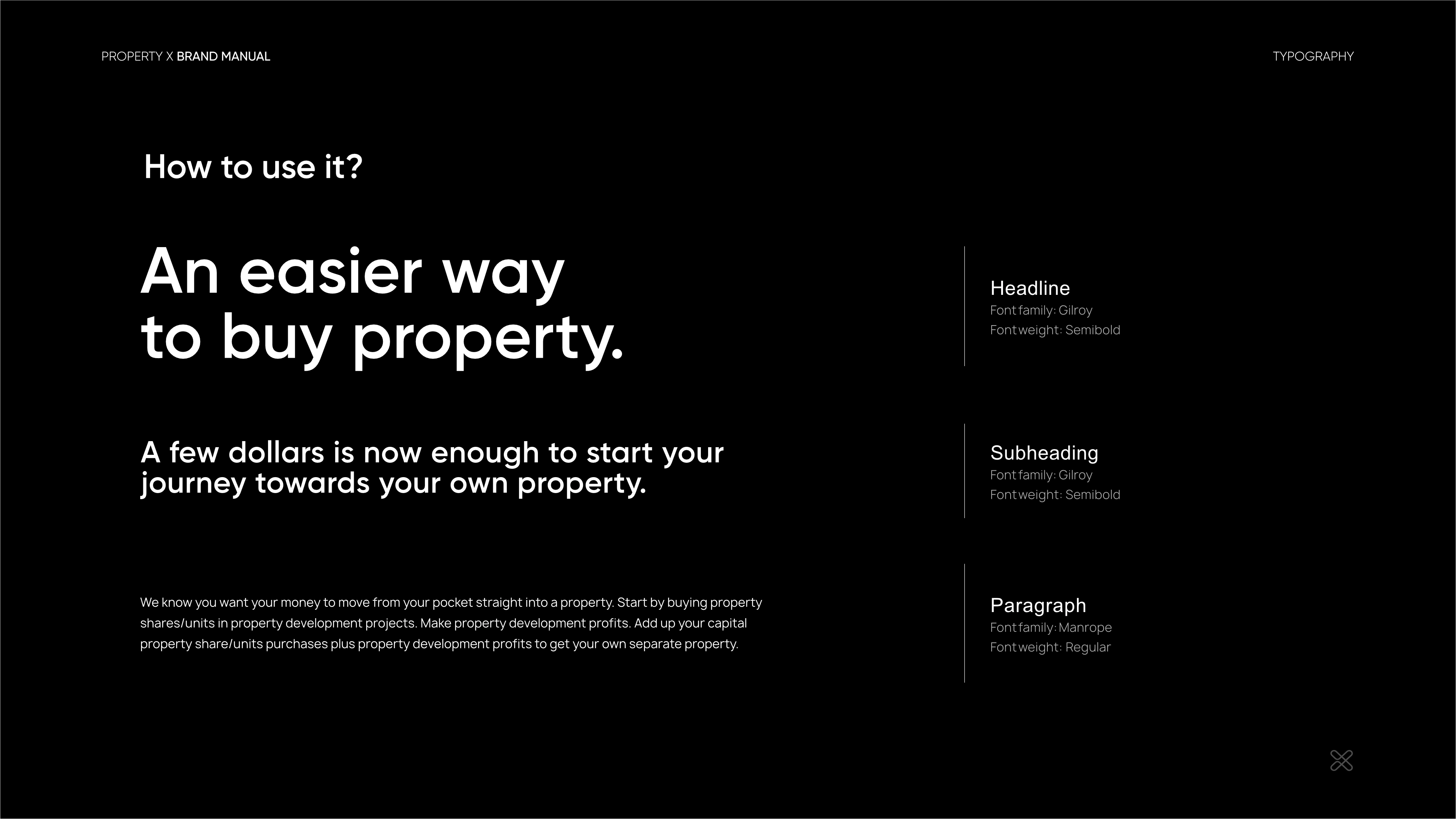 In early 2025, I led the branding for Property X, including the creation of its brand manual. Property X is a platform designed to make property ownership more accessible by eliminating traditional barriers like deposits and high monthly instalments. I was responsible for translating the platform’s unique investment model—where users buy property shares or units that earn returns from development profits into a clear, consistent visual identity. This included defining the brand’s tone, look and feel, and design system to ensure consistency across all touchpoints.