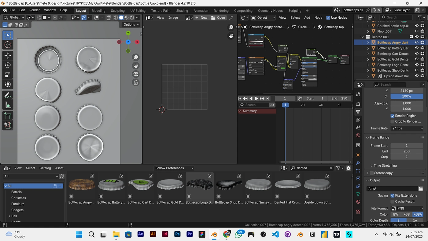 Initially, they felt too shiny, so I pushed further into realism with rust textures, dents, and crushed variants to tell a story of age and imperfection.