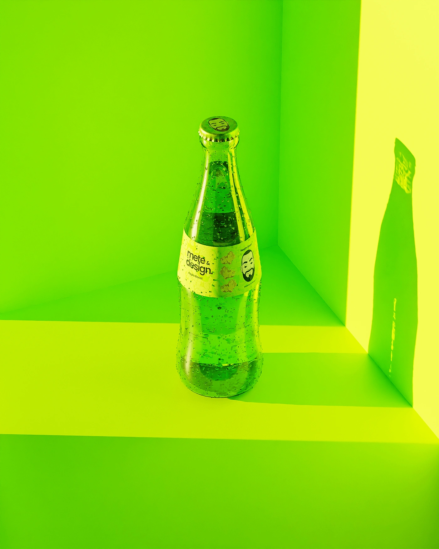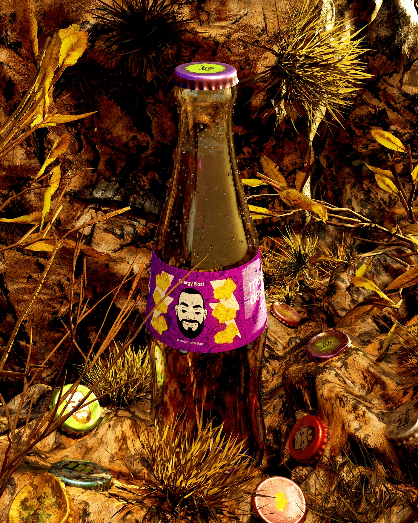 I went ahead and placed the caps on bottles with condensation droplets using geometry nodes also bottles with custom labels I designed for a complete context,