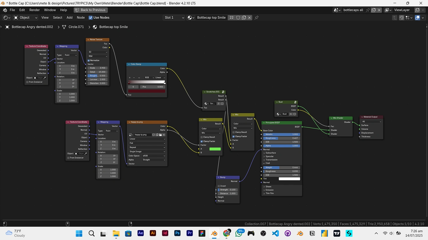 In order to get the rust and scratches on specific parts of the bottlecaps, I used the pointiness value from the Geometry Node in the shader editor, connected it to a color ramp node for more control then connected it to the factor of a mix shader node that has the rust and the origianl material connected to it.