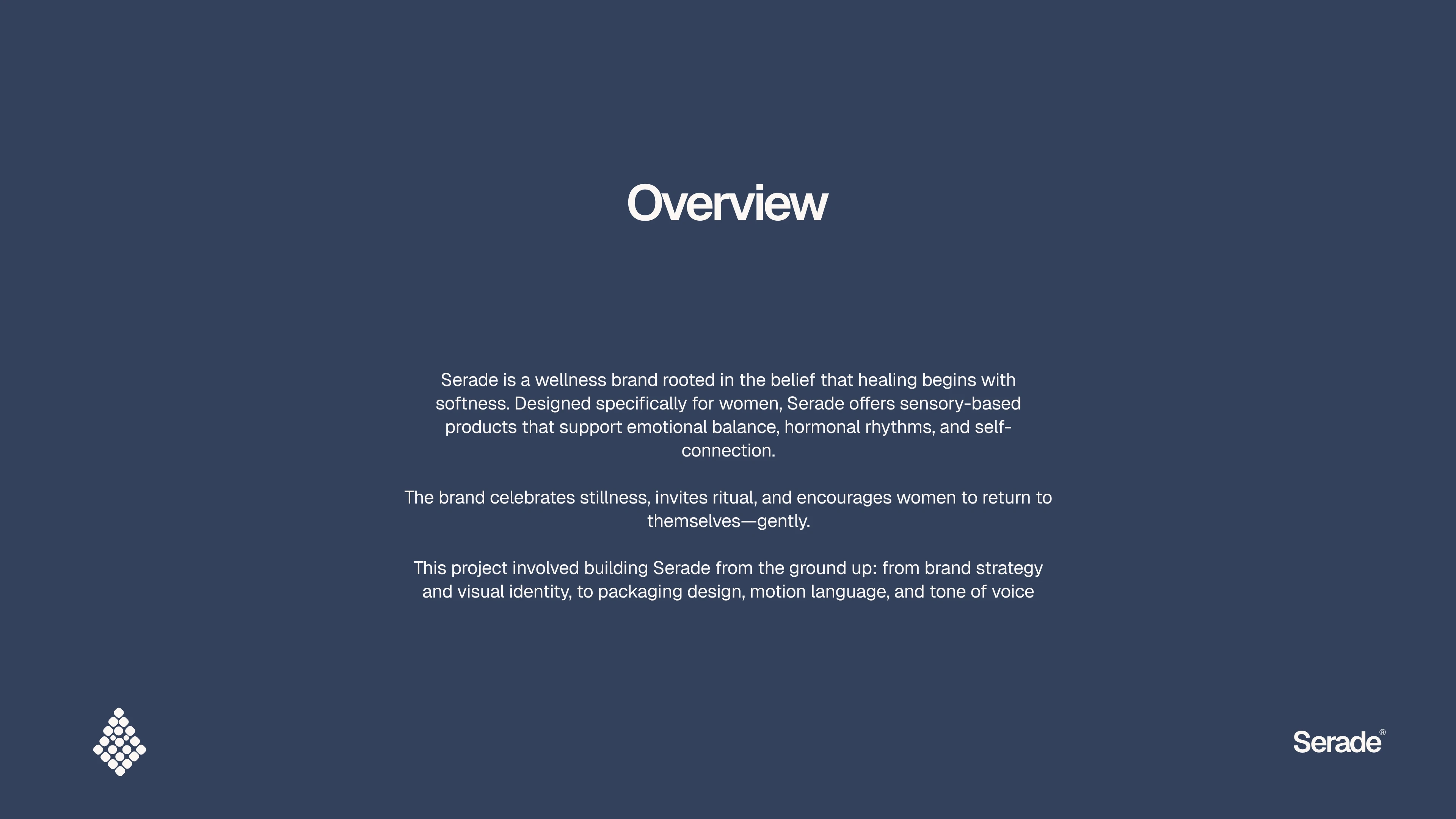 I served as the brand strategist and creative lead, shaping Serade’s identity from the ground up. This included developing the brand’s positioning, tone of voice, messaging framework, and creative direction — all rooted in a narrative that celebrates softness, self-connection, and quiet strength