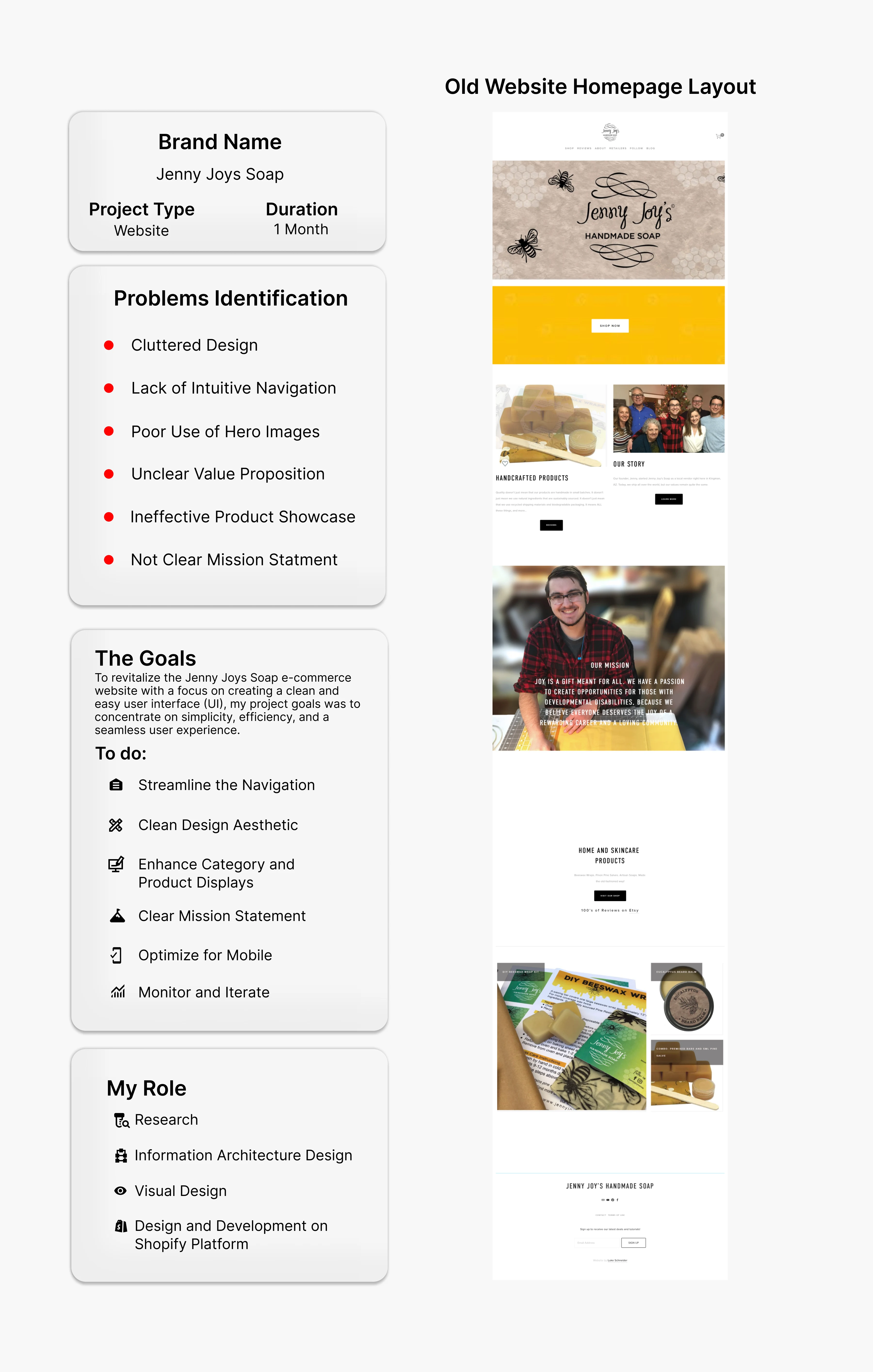 Jenny Joys Soap, a US-based business specializing in handmade soaps, beard balms, and eco-friendly products, was facing challenges in generating sales through their online platform. The website's lack of user engagement and poor conversion rates indicated a need for a comprehensive redesign to enhance the shopping experience and boost sales.