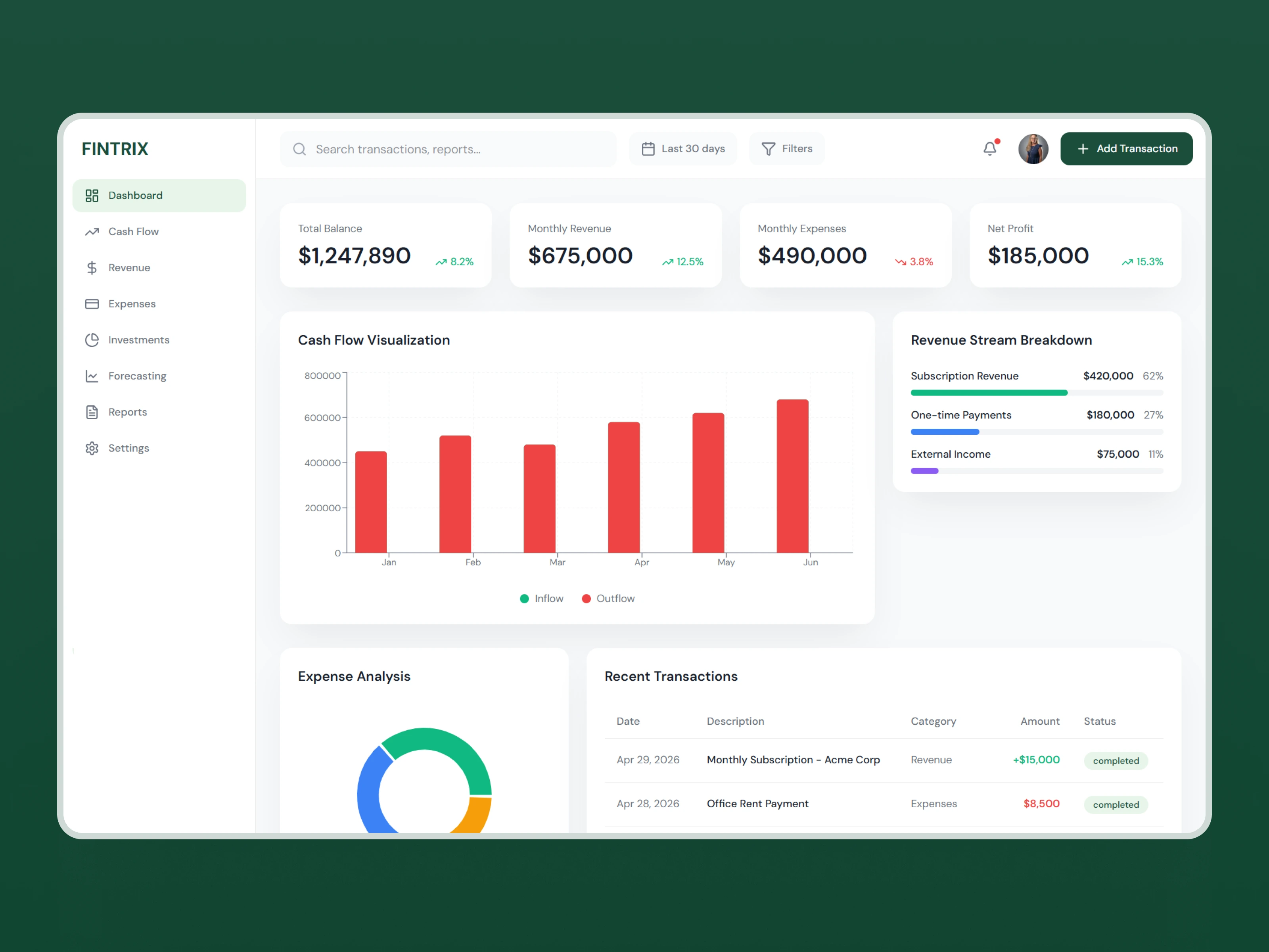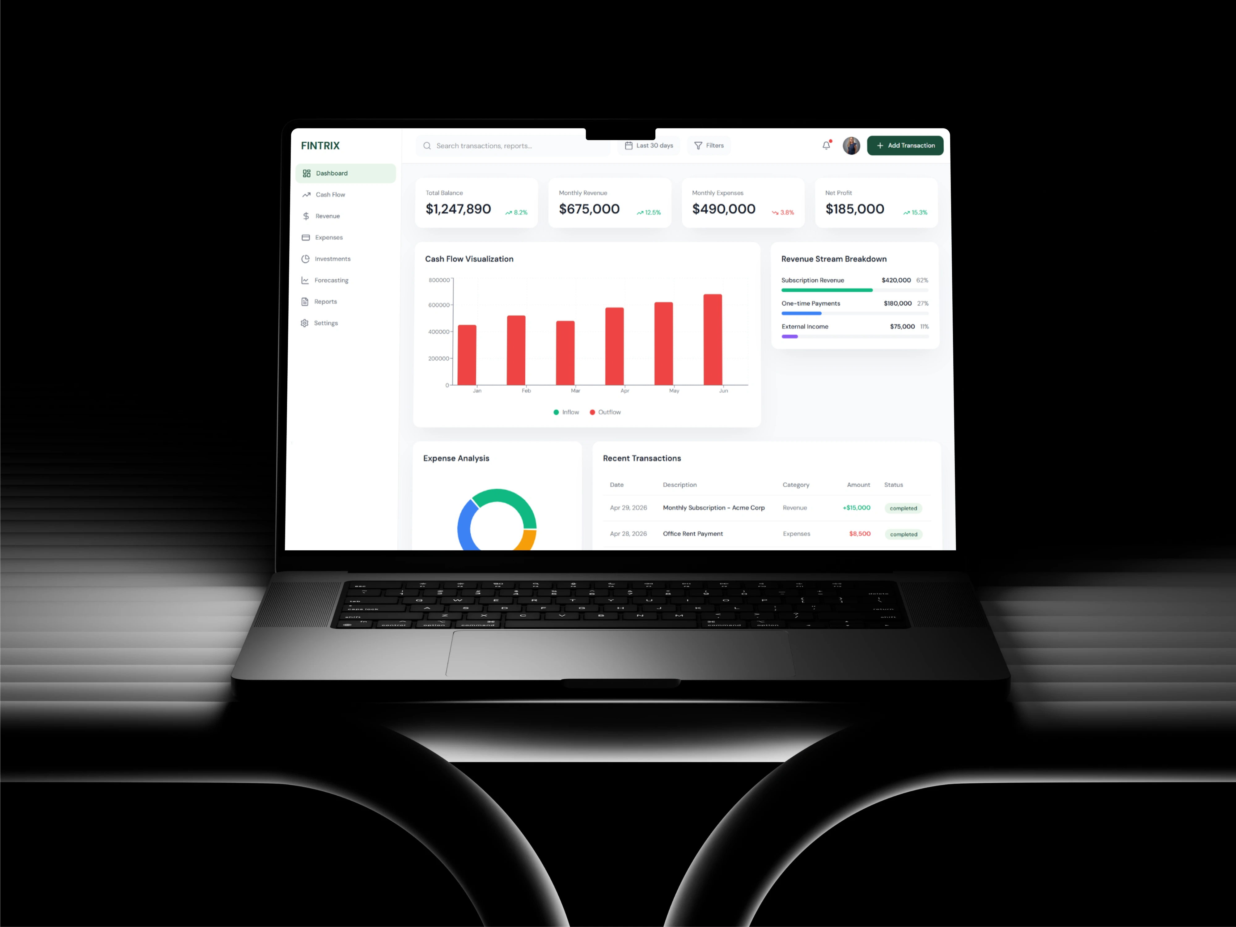 A financial control system designed for clarity, not complexity. FINTRIX transforms scattered financial data into a structured, decision-ready dashboard where revenue, expenses, and forecasting live in one unified view.