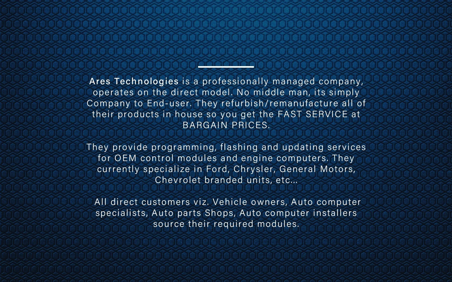 Ares Technologies delivers in-house refurbished OEM modules with fast service and low prices, offering programming and flashing for Ford, GM, Chrysler, Toyota.!