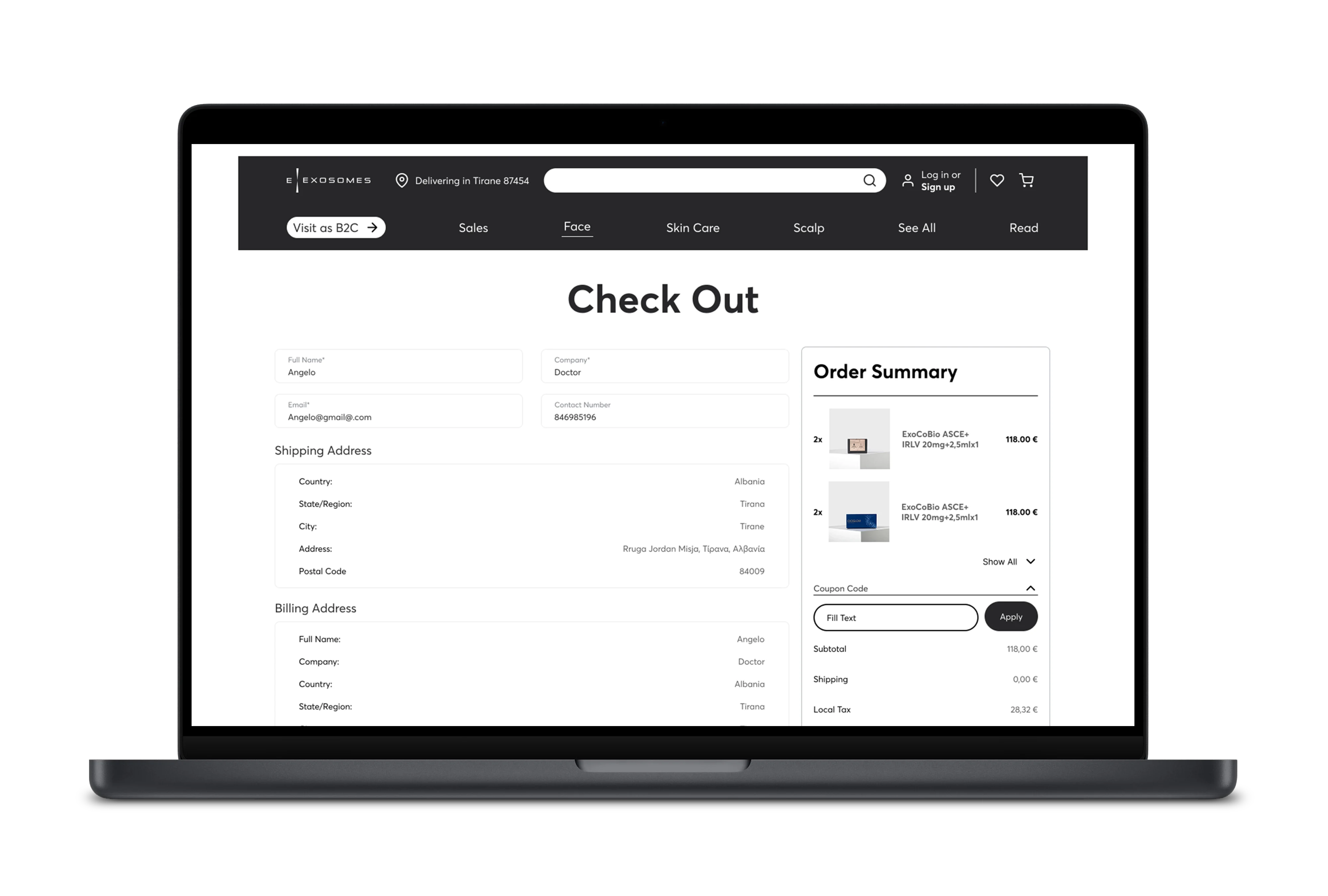 E-exosomes is the second e-commerce platform under the e-fillers.com umbrella, designed specifically for the B2B market. It caters to clinics, doctors, and merchants around the world. The goal with this eshop was to keep things clean, simple, and user-friendly while also offering rich, accessible information about exosomes through well-organized articles.