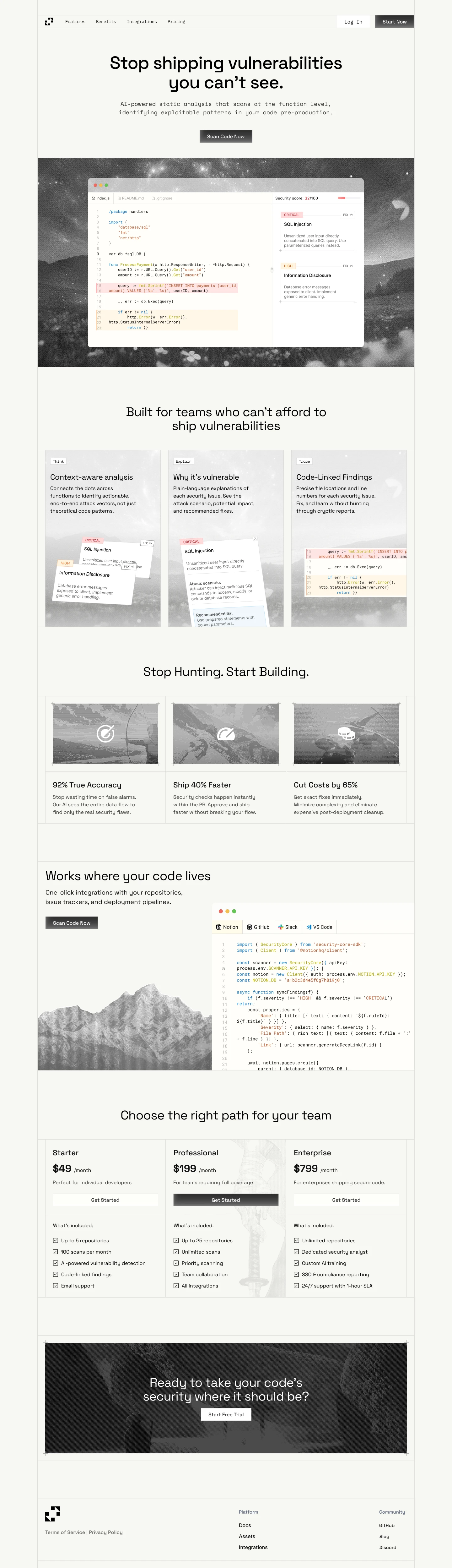 The landing page carries the brand's cinematic quality into every scroll. Hero sections blend dithered illustrations with clean code snippets, showing rather than telling. "Stop shipping vulnerabilities you can't see" isn't buried in paragraph text - it's a statement backed by visual proof.