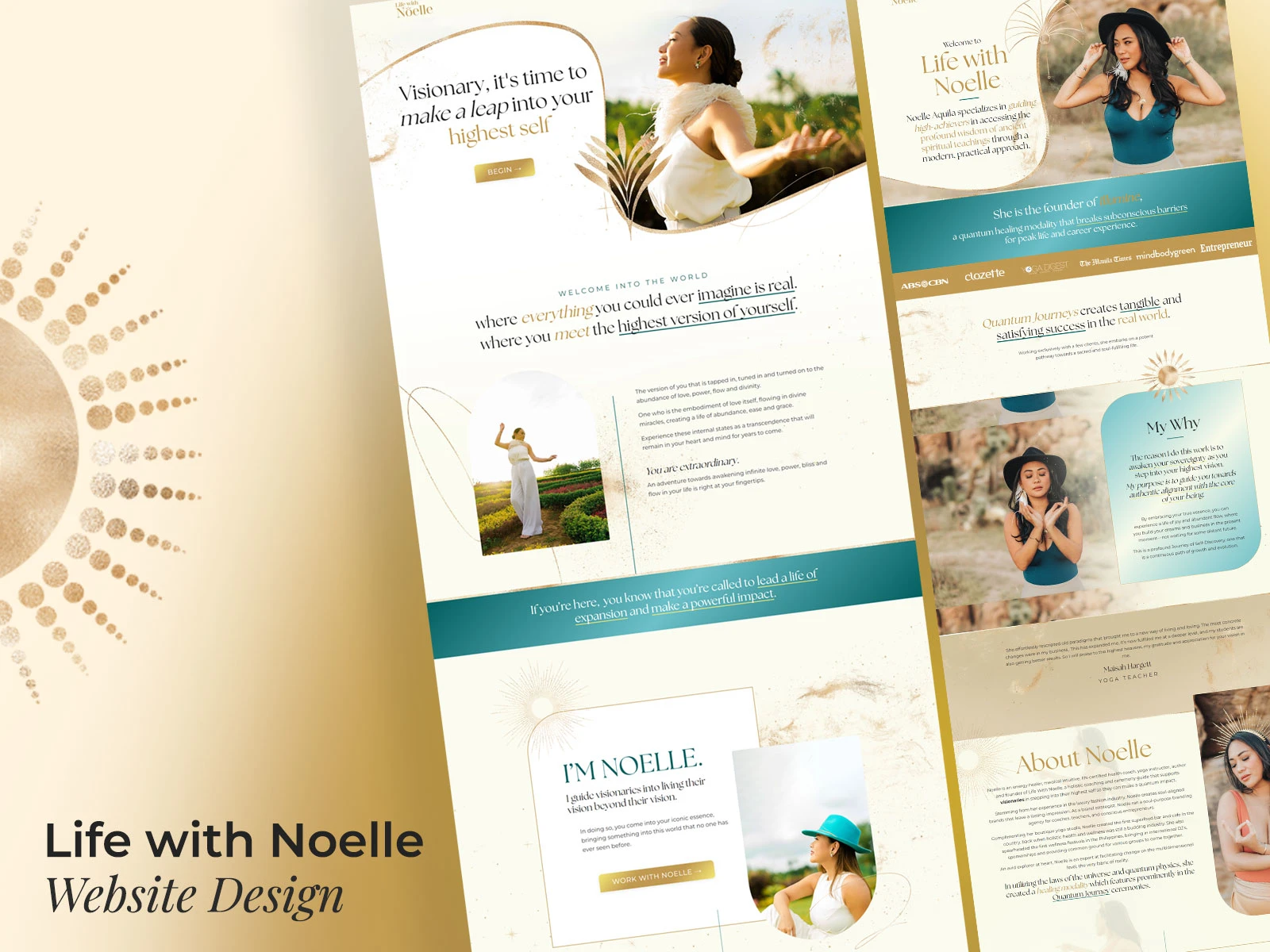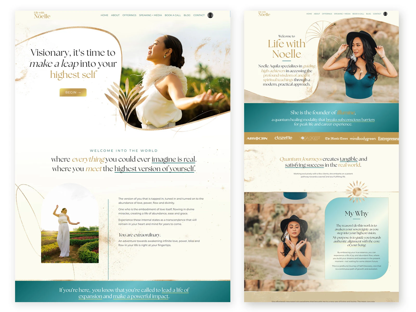 Revamped Noelle Aquila’s Kajabi website with mystical elements and gold accents, creating a calm yet energized design that reflects her unique brand.