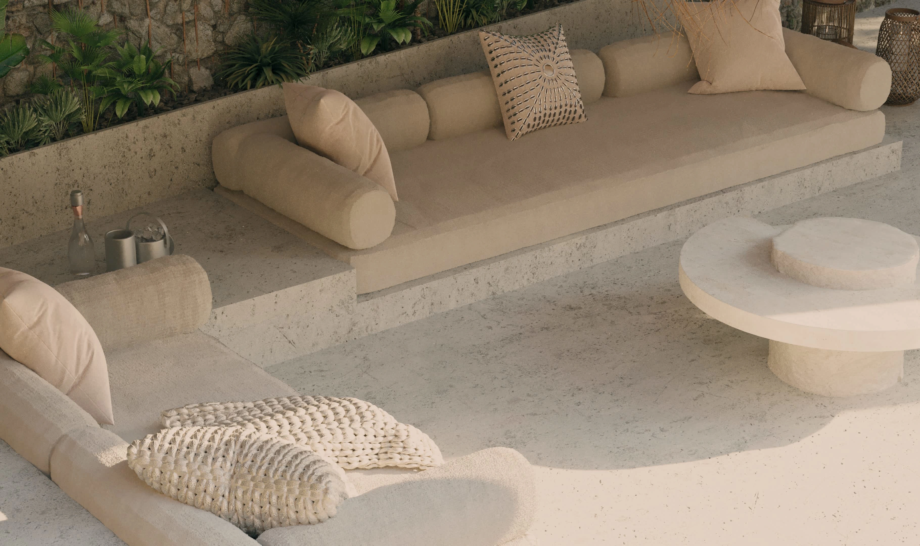 A villa, nestled on a spacious 1,900m² lot, offers 230m² of cozy living space. It's a charming blend of Wabi-Sabi, Bali and Mediterranean styles, featuring natural materials like wood, concrete, wicker, and travertine, alongside modern elements like porcelain countertops. The heart of the home is a rustic fireplace made from a chunk of natural stone. The living room and kitchen overlook the pool, creating a seamless indoor-outdoor vibe.