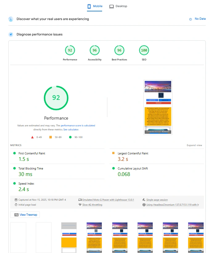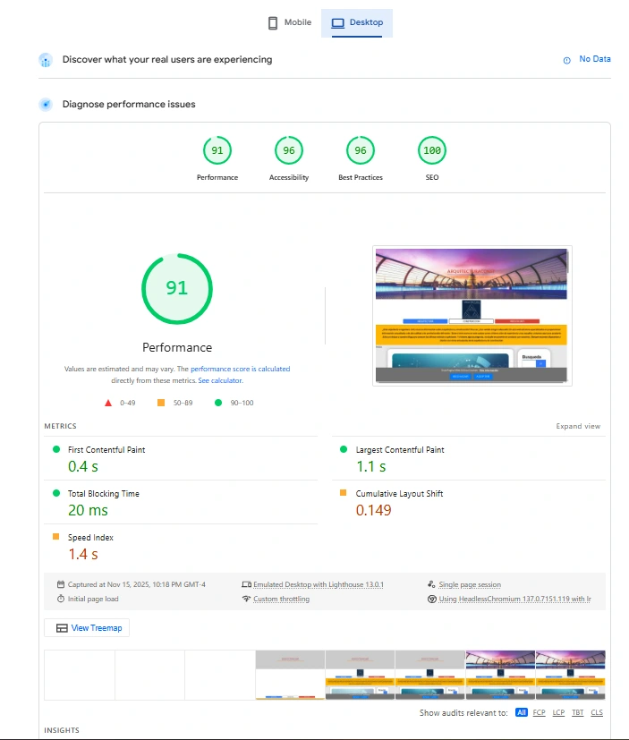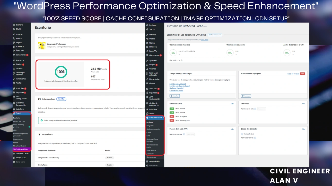 Achieved 100% performance score through advanced LiteSpeed Cache configuration, image optimization (22.5 MB saved across 607 images), CSS/JS minification, and CDN integration for maximum speed.