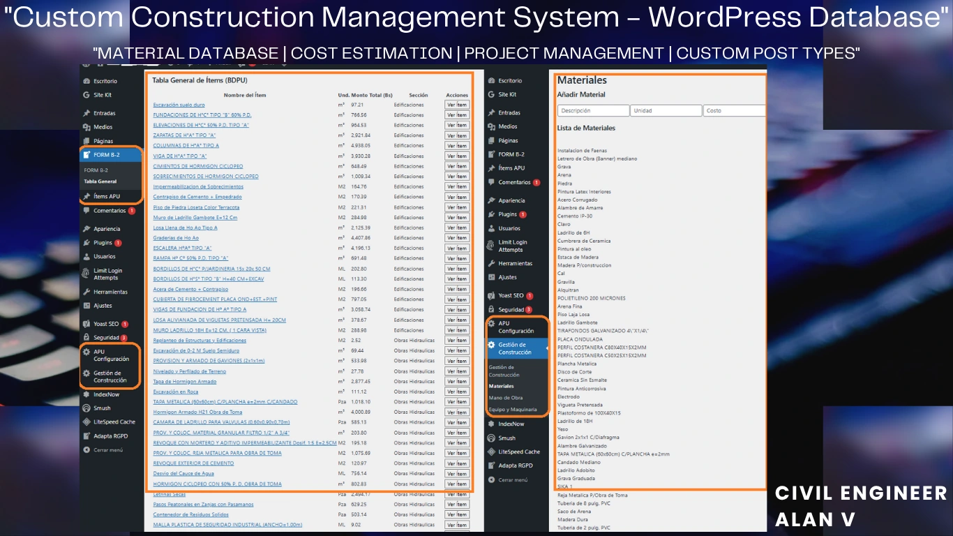 Advanced WordPress construction management platform with 1,000+ material database, automated BDPU generation, real-time cost calculations, and comprehensive inventory tracking system tailored for civil engineering projects.