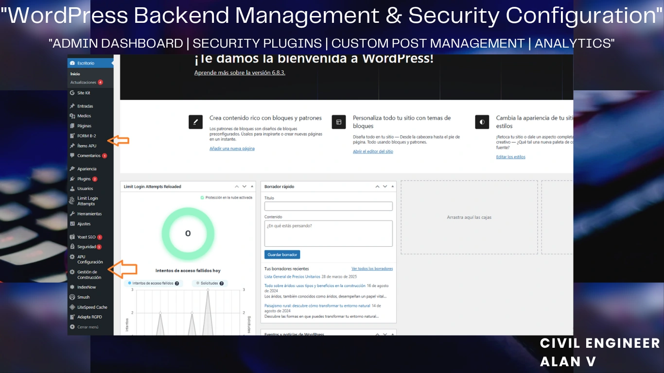 Complete WordPress admin panel configuration with security hardening, custom post types for construction projects, login protection (0 failed attempts), and integrated analytics dashboard for real-time monitoring.