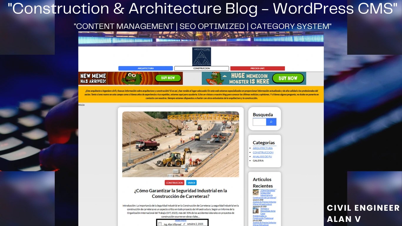 Professional WordPress blog for construction industry with SEO optimization, custom category system, search functionality, and mobile-responsive design for architecture and engineering content management.