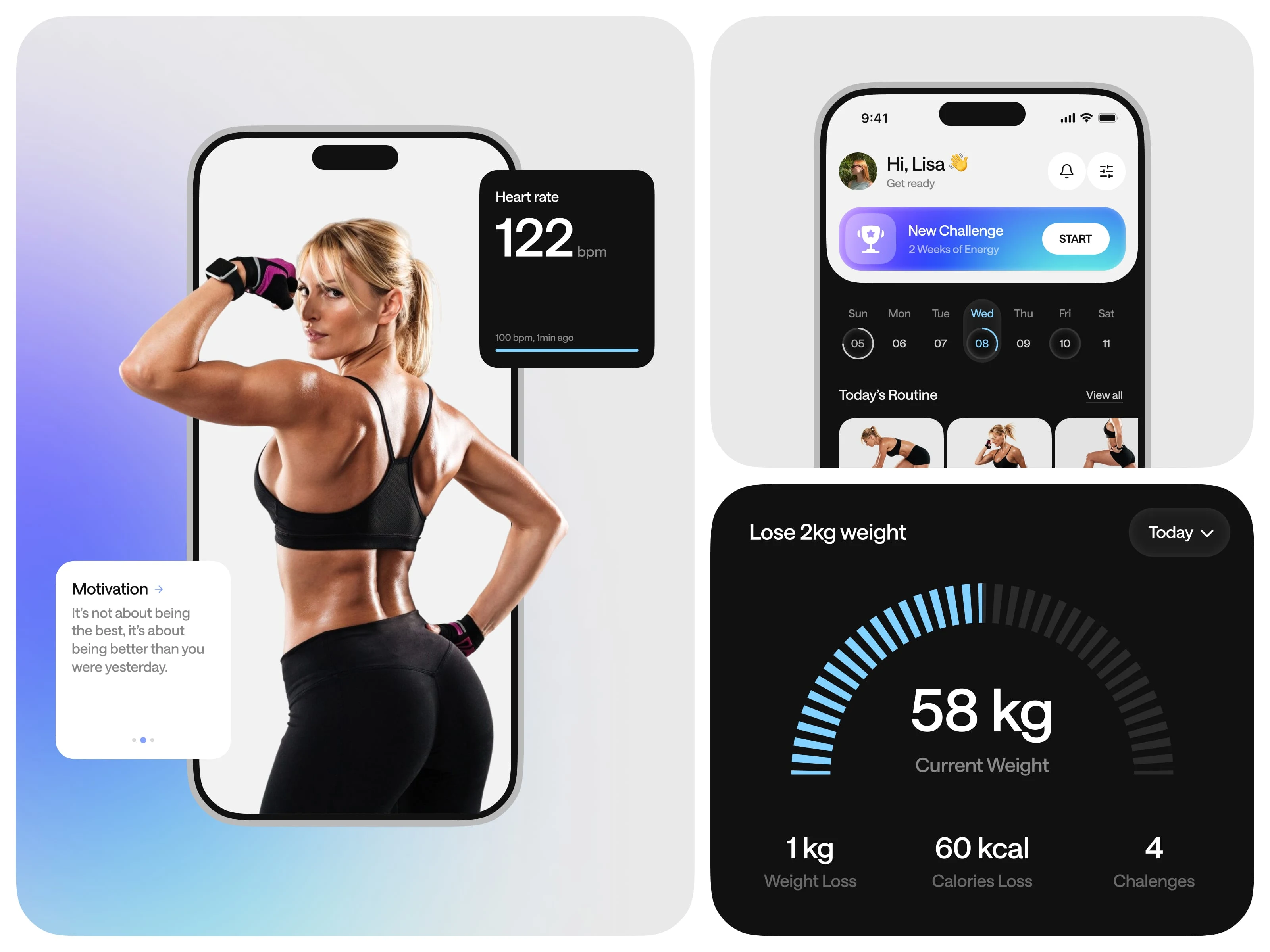 FitFlow is a modern fitness mobile app designed to help users achieve their health goals through personalized workout tracking, progress insights, and motivation tools. Built in Figma, the interface combines sleek visuals, intuitive navigation, and detailed metrics — from weight loss progress to daily routines and activity logs. The design uses light and dark modes, minimal gradients, and motivational imagery to inspire consistency and energy in every workout.