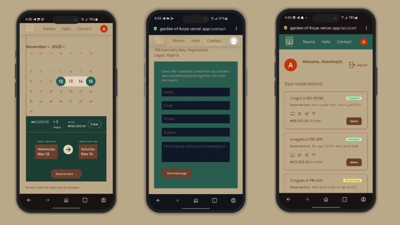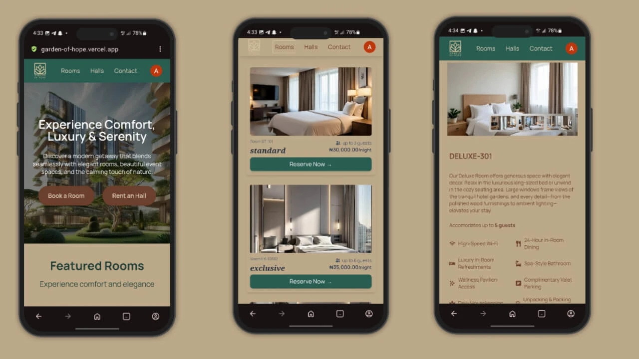 The Garden of Hope Hotel Web App is an elegant and user-friendly platform designed to bring the calm and welcoming experience of a real hotel into the digital world. It allows guests to explore rooms, check availability, make reservations, and contact the hotel, all in a seamless and visually appealing interface.