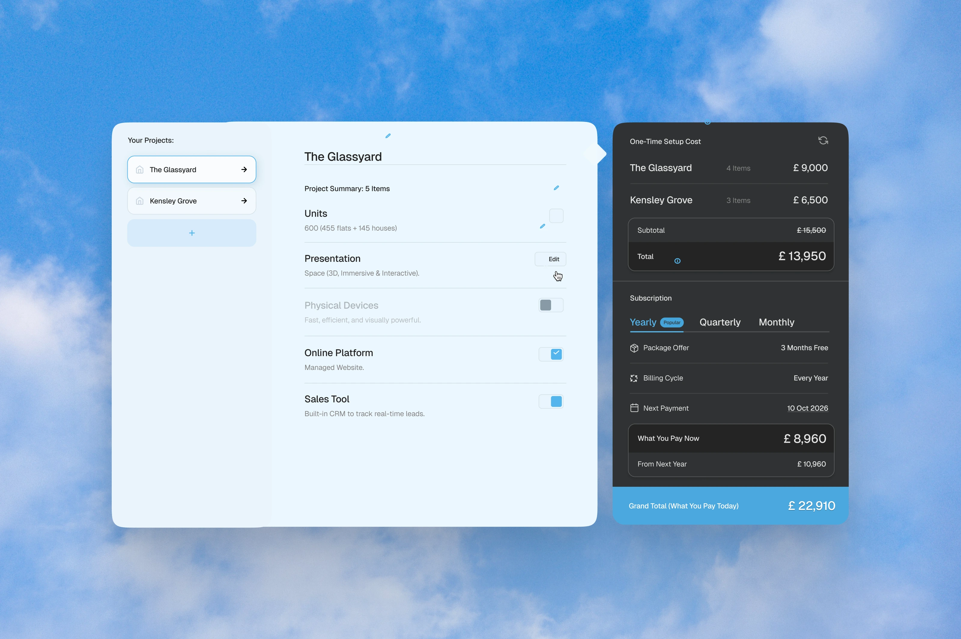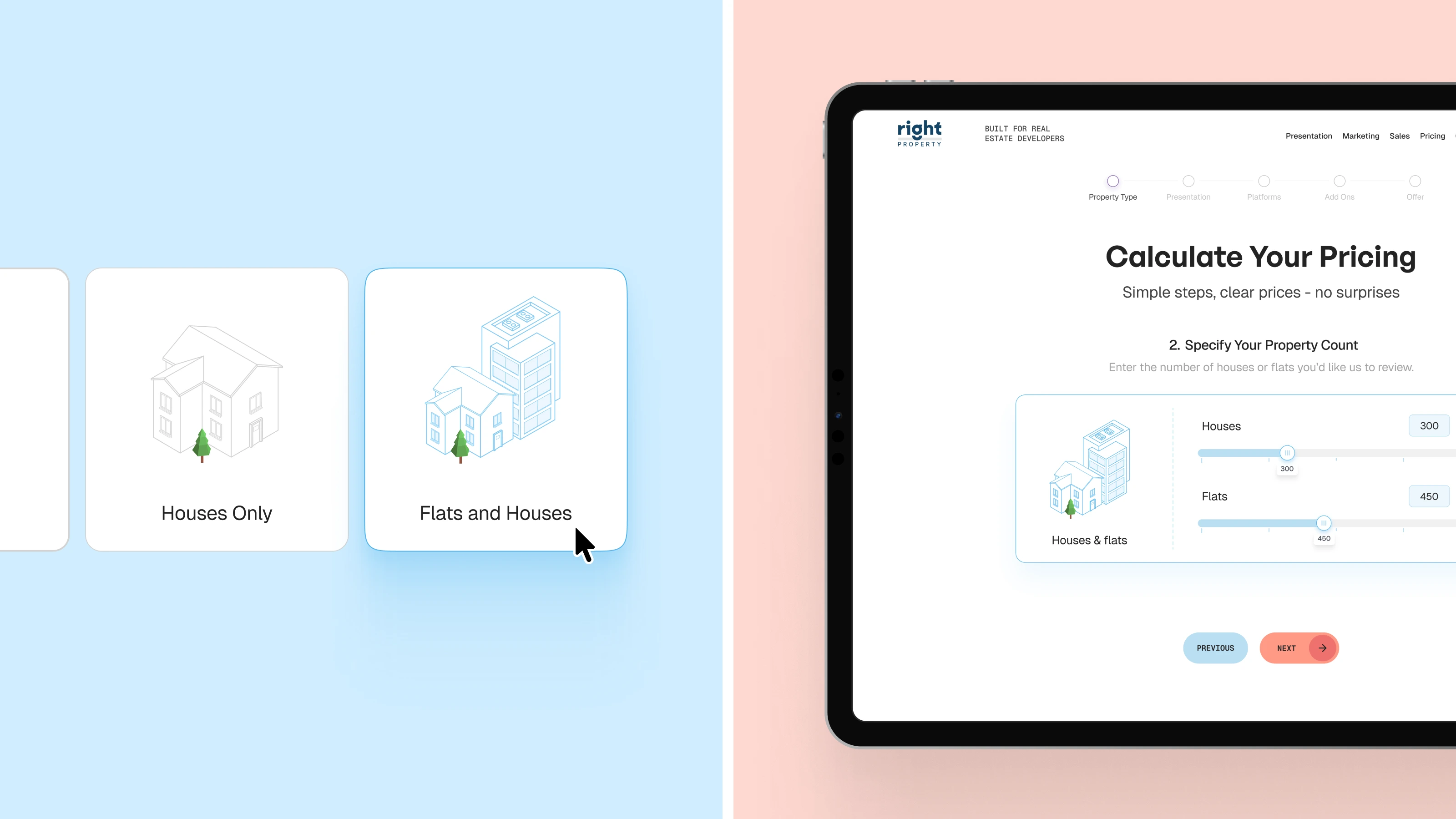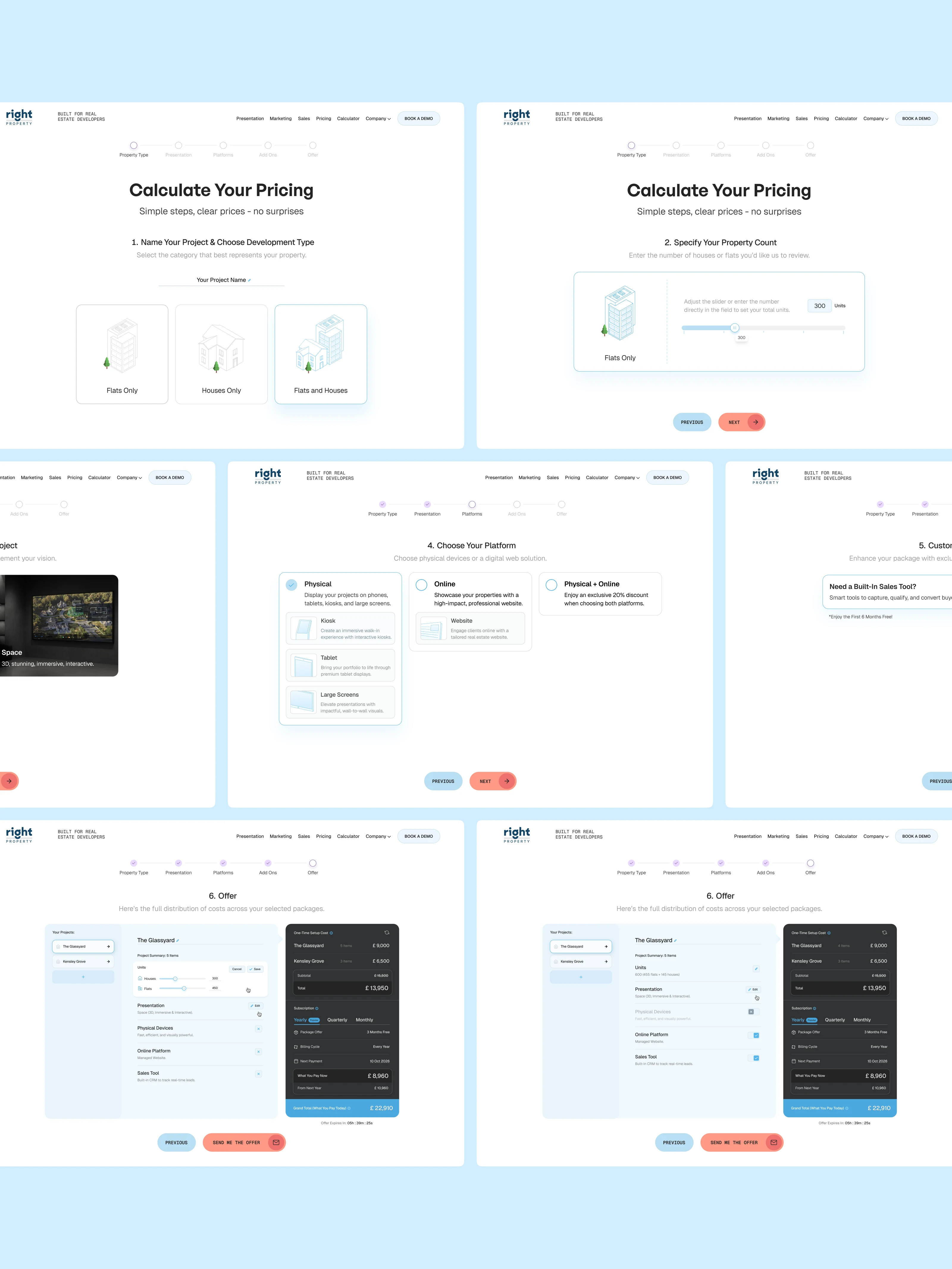 Right Property’s sales tool was designed to simplify complex proposal and pricing workflows for real estate agencies. Through carefully crafted user journeys, clear interaction flows, and an intuitive interface, the platform enables teams to quickly calculate pricing, generate proposals, and present projects with confidence — turning a traditionally manual process into a streamlined, technology-driven experience.