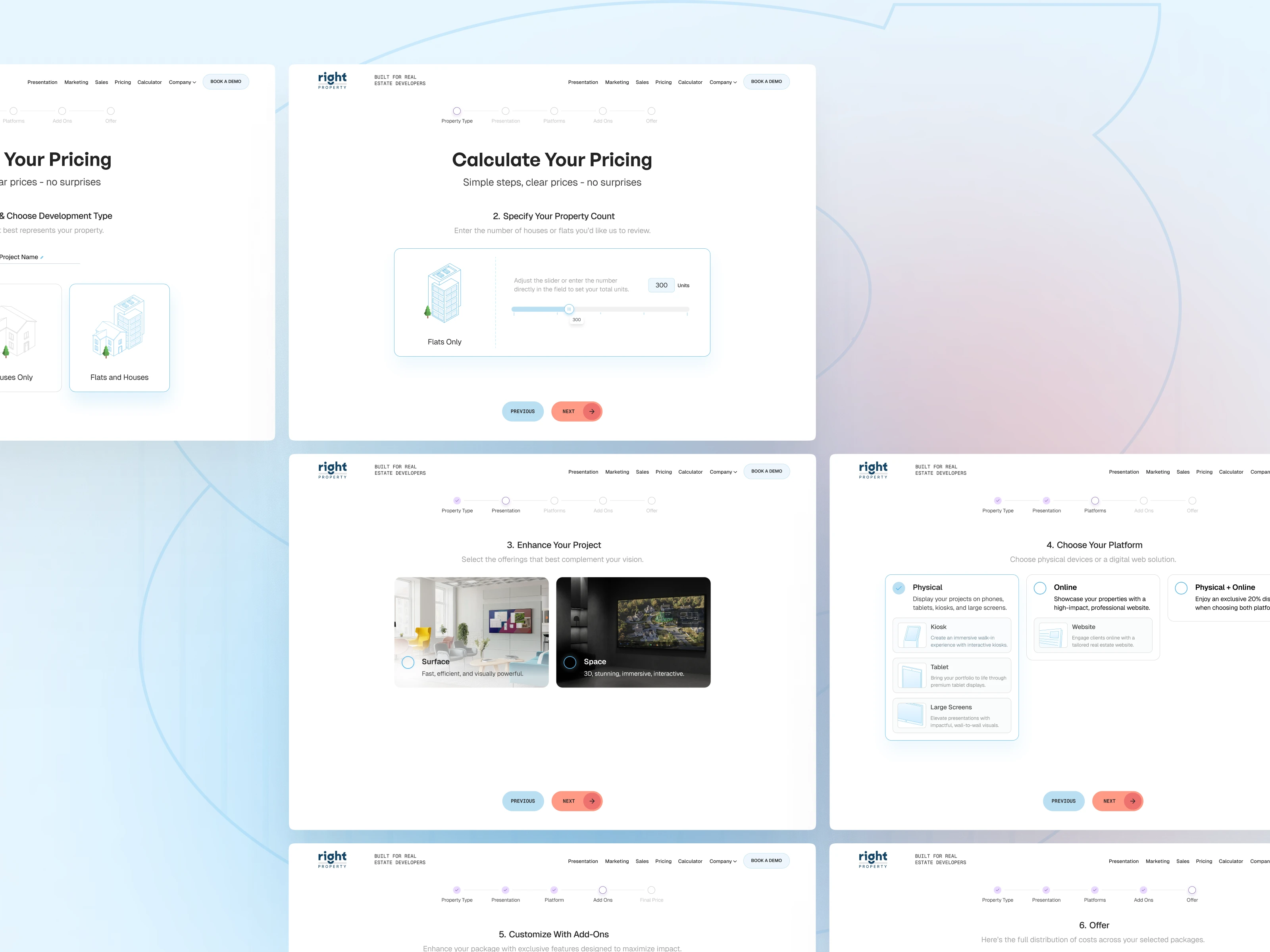 Right Property’s sales tool was designed to simplify complex proposal and pricing workflows for real estate agencies. Through carefully crafted user journeys, clear interaction flows, and an intuitive interface, the platform enables teams to quickly calculate pricing, generate proposals, and present projects with confidence — turning a traditionally manual process into a streamlined, technology-driven experience.