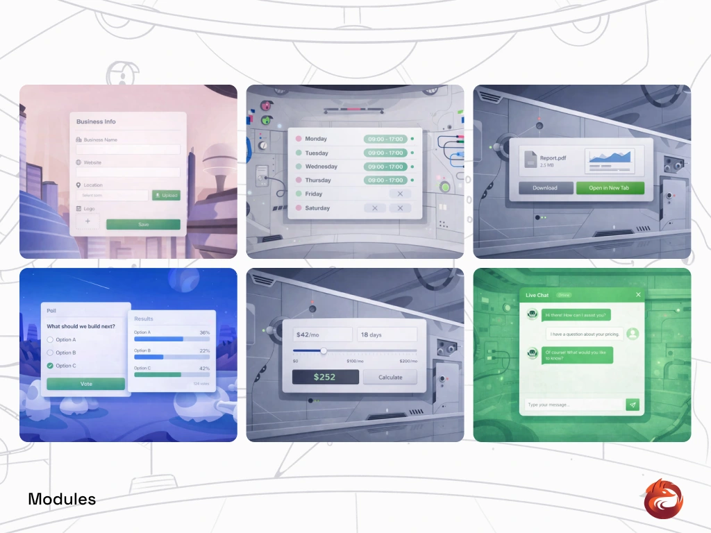 These modules can be activated by Gatsboy customers to unlock power ups for their Framer website, the biggest being the Booking, Live Chat and Forms modules.