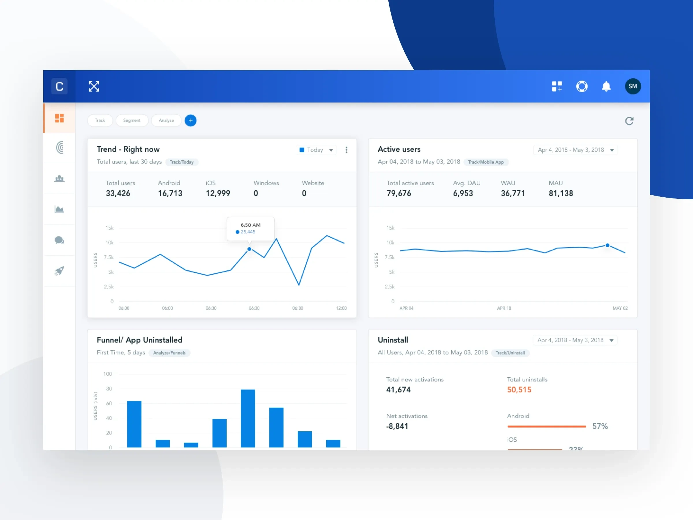 This project showcases a clean and intuitive analytics dashboard designed for a SaaS platform. The goal was to help product and marketing teams easily track user engagement, app performance, and uninstall trends across multiple platforms.