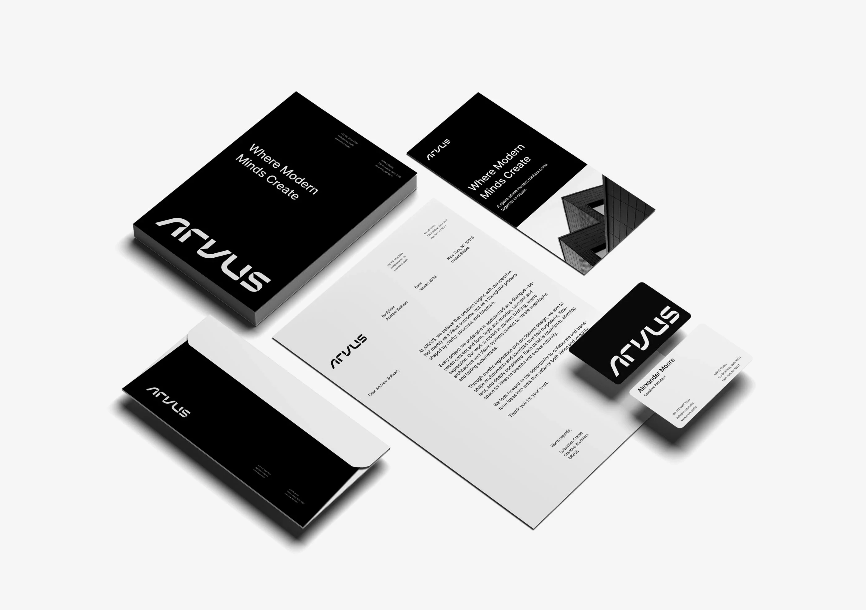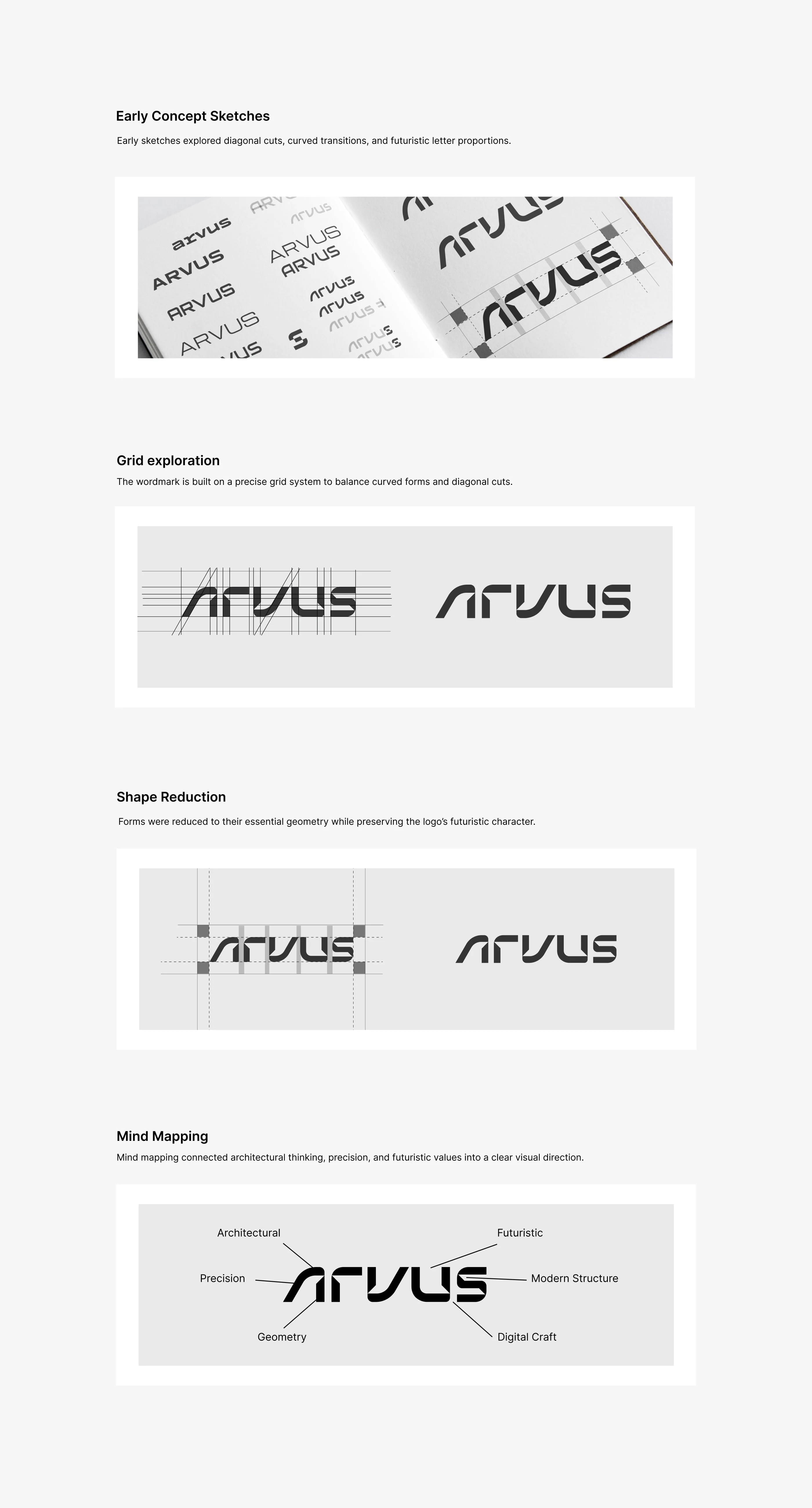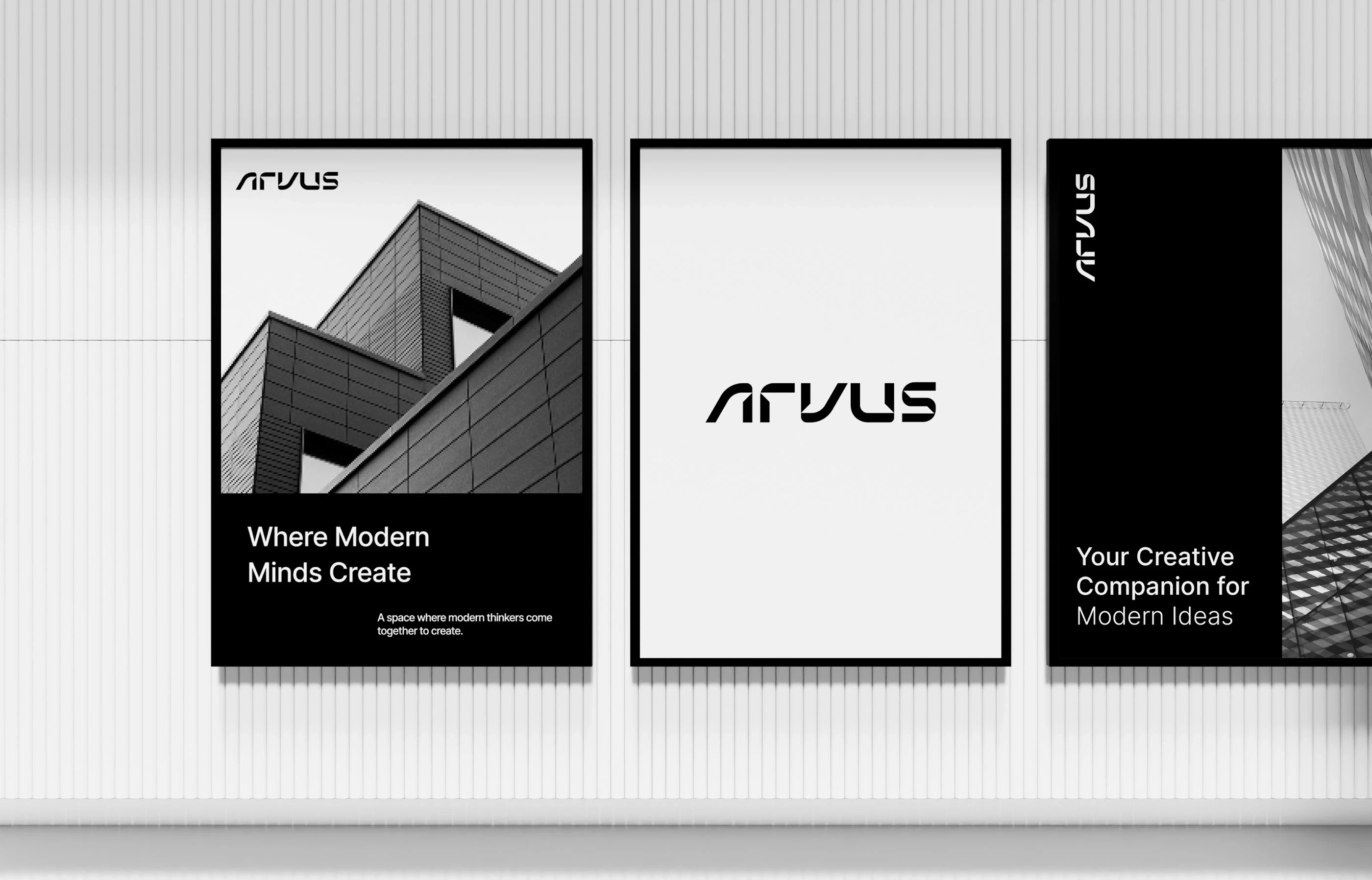 Arvus is a modern visual identity project that explores clarity, structure, and forward thinking design through a futuristic architectural lens. Created as a system driven brand, Arvus emphasizes precision, balance, and simplicity, drawing inspiration from modern architecture, geometric order, and clean technological aesthetics. Rather than relying on decorative elements, the identity is built on strong foundations grids, proportions, and modular forms allowing it to remain flexible, scalable, and relevant across various creative, digital, and spatial applications. Arvus represents a mindset where design is not only about appearance, but about structure, logic, and long-term vision.