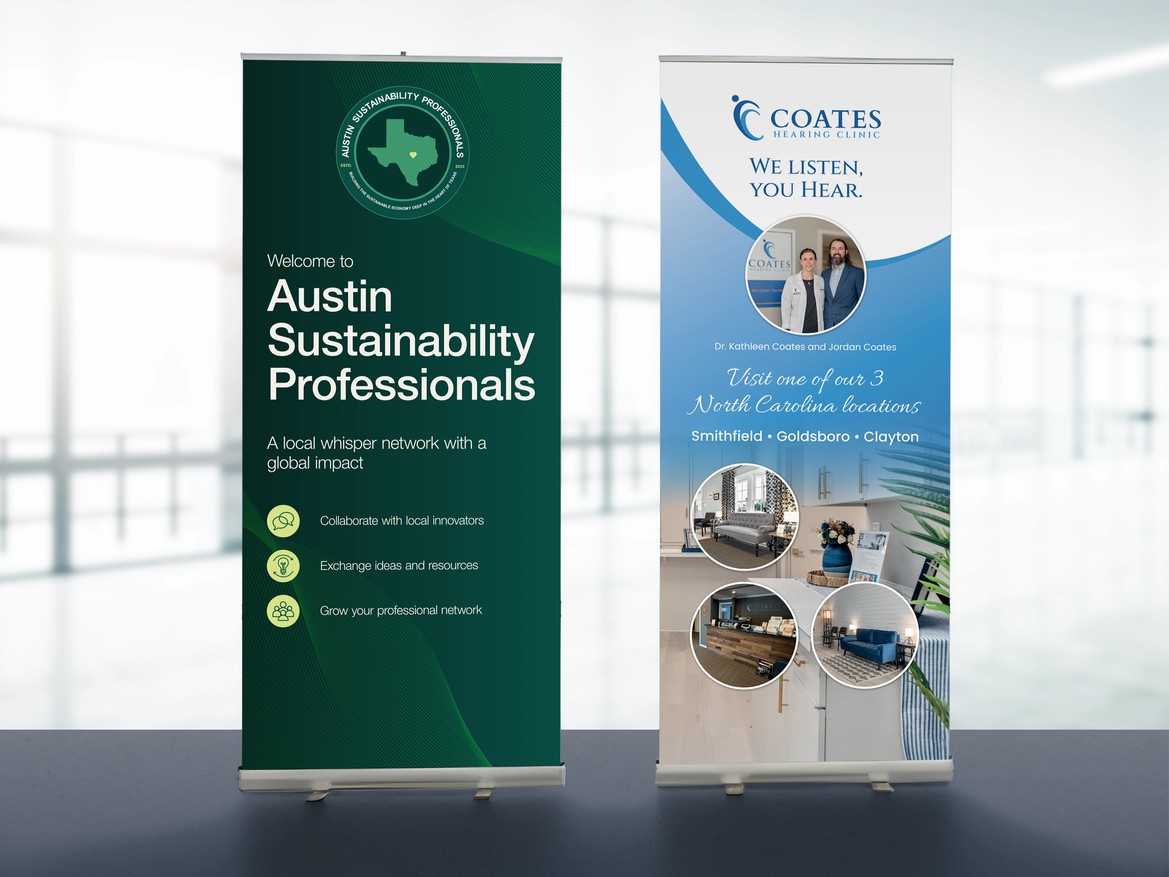 Custom banners for Coates Hearing Clinic & Austin Sustainability Pros—inviting visuals and messaging designed for warmth, engagement, and brand clarity.