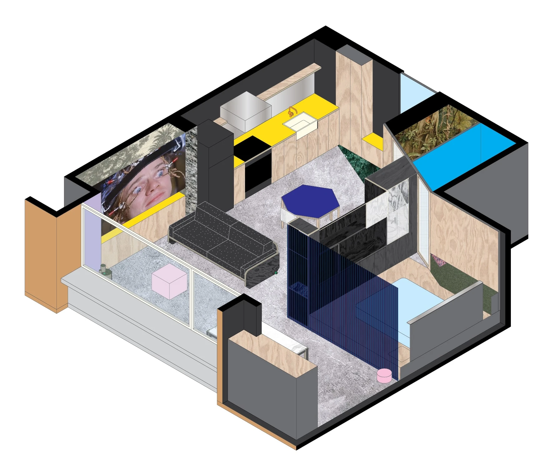 Interior and furniture design for small apartment. Conceptual 3D renderings and 2D images.