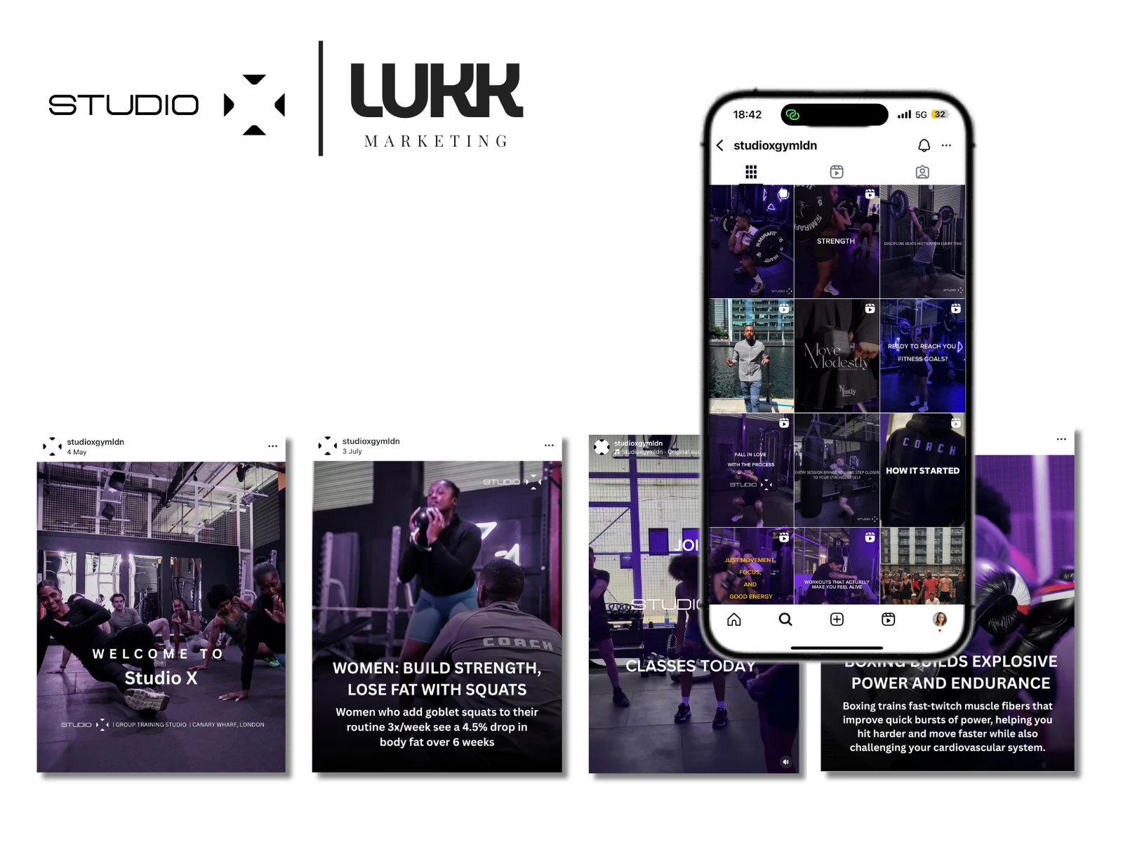 I worked with Studio X, a group fitness training studio based in Canary Wharf, London. I managed organic social media content and paid advertising with a strong focus on driving local awareness and class bookings.