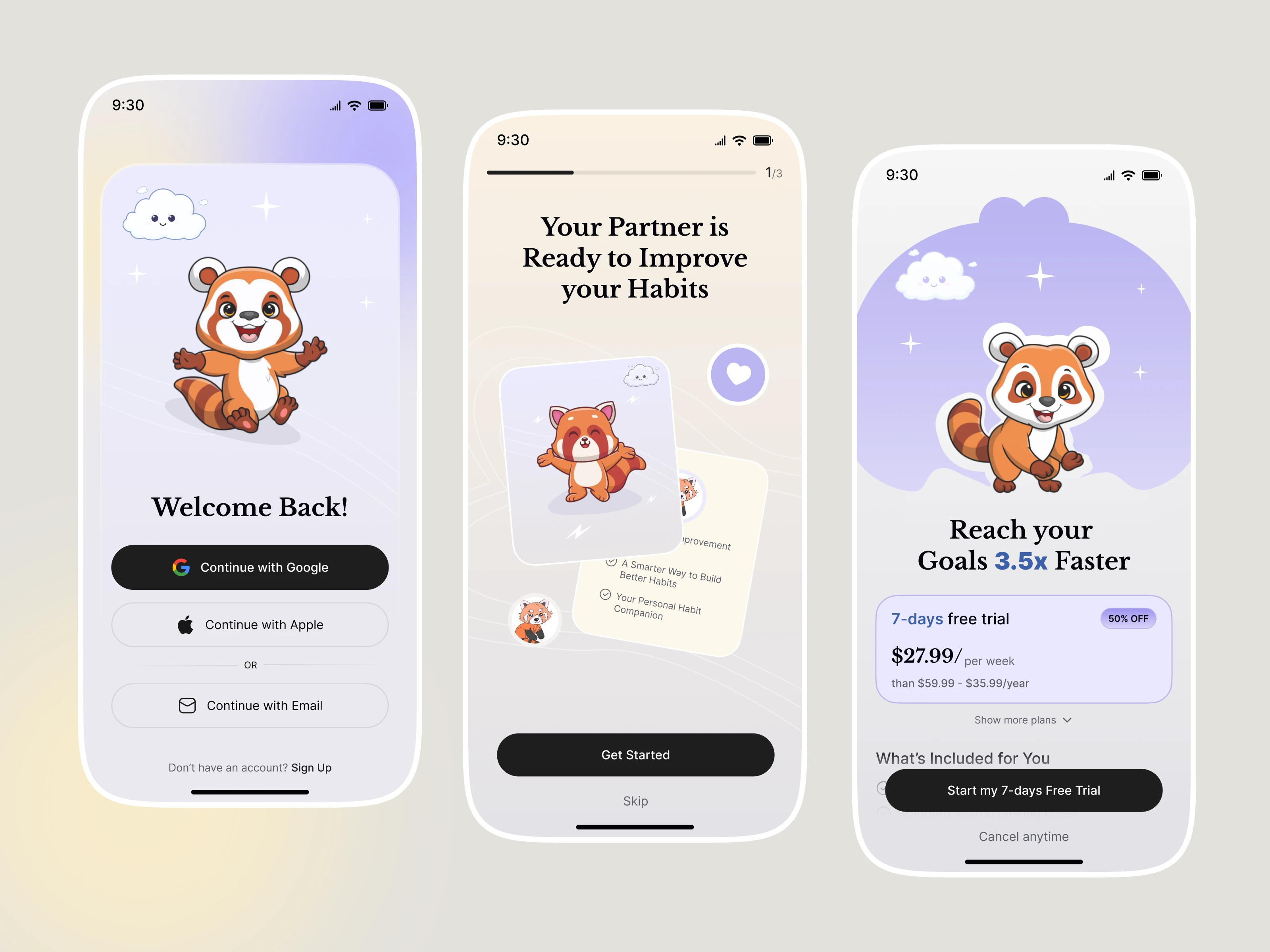 The experience is crafted to reduce friction and increase consistency—helping users track habits, stay motivated, and reach their goals faster. Soft gradients, pastel colors, and playful illustrations create an emotional connection while maintaining a clean, scalable UI suitable for real-world products.