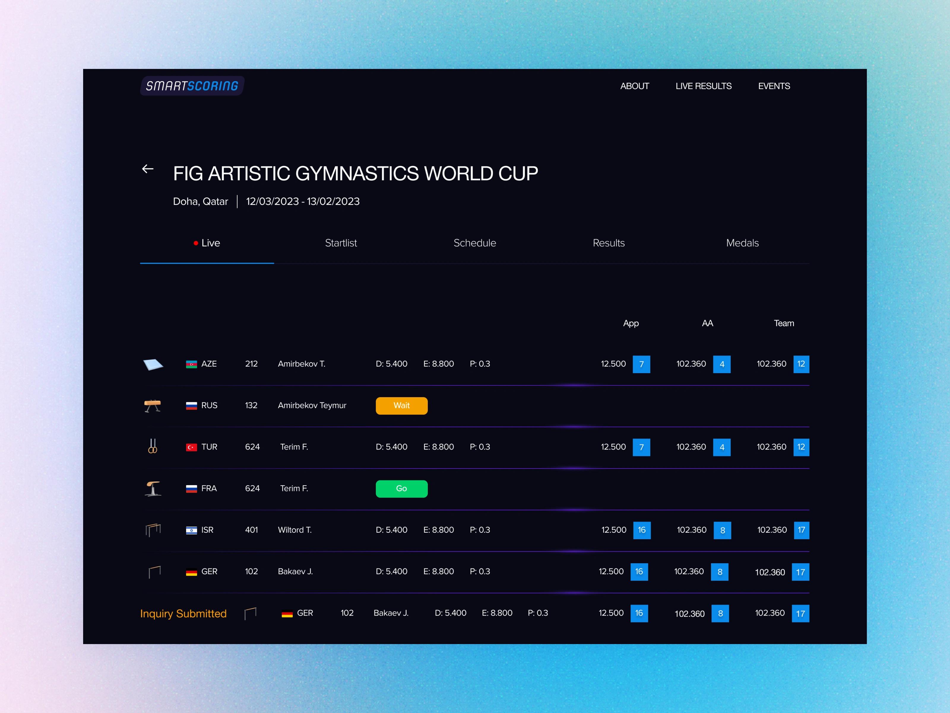 Smartscoring Results was created to make gymnastics competitions easier to follow for everyone - from passionate fans to first-time viewers. The platform brings together upcoming events, live scores, and historical results in one clear, accessible space, available on both web and mobile. The goal was simple: turn a complex scoring world into something anyone can understand at a glance.