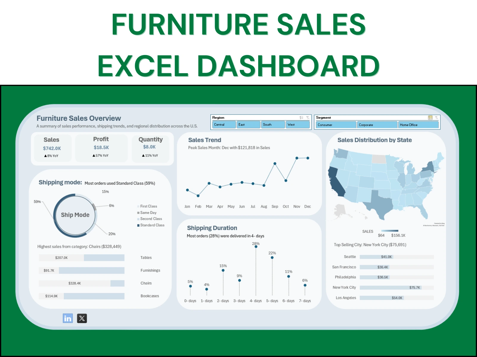 A retail furniture company wanted to better understand its sales performance, shipping trends, and regional distribution across the United States. The client needed an interactive, visually appealing dashboard built in Excel to present key insights to stakeholders.