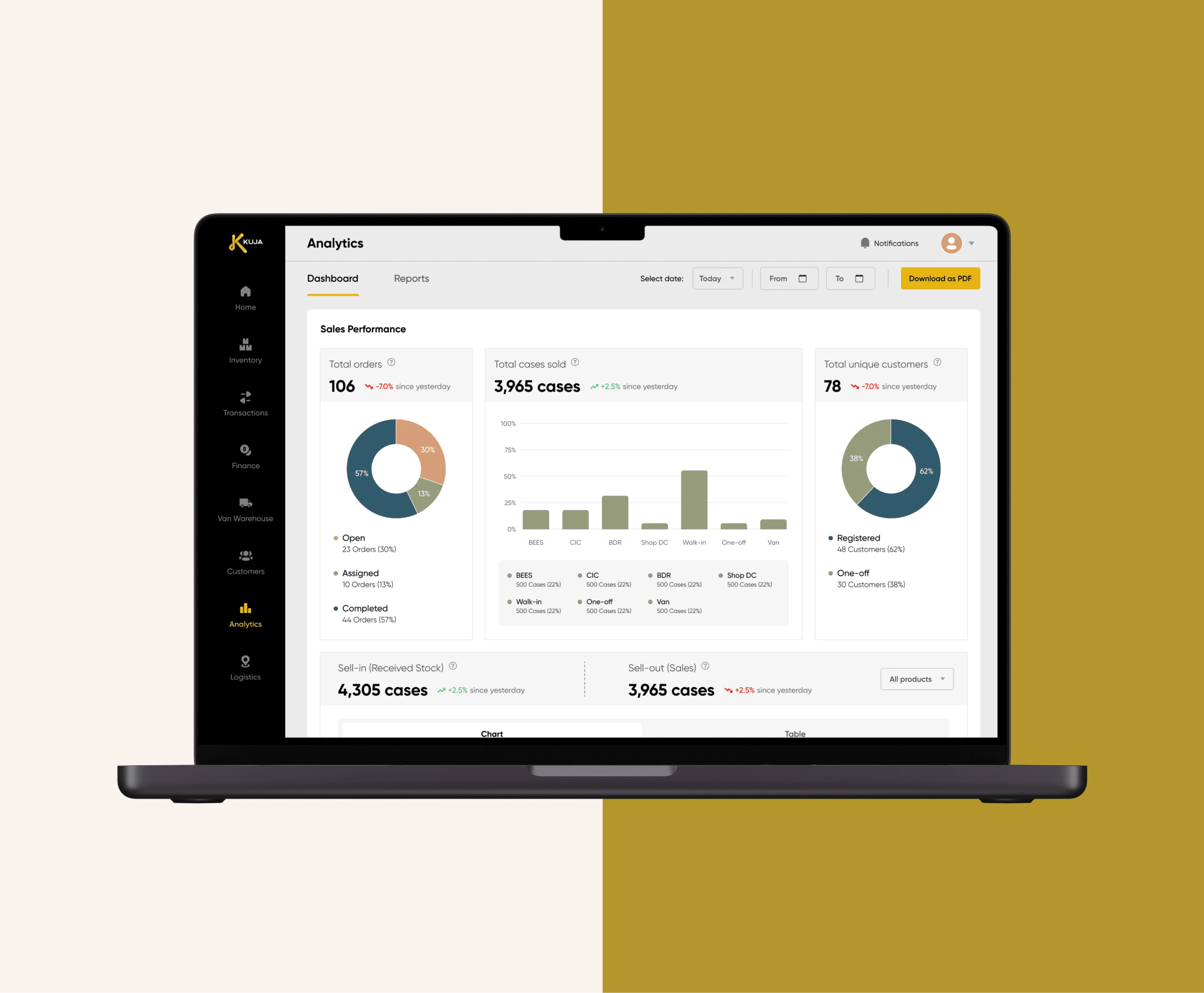 Distributors use the Kuja web app to track the movement and sales of ABinBev products (SKUs). The distributor can see what products are low in stock and reorder stock, see their progress and analytics and so much more.