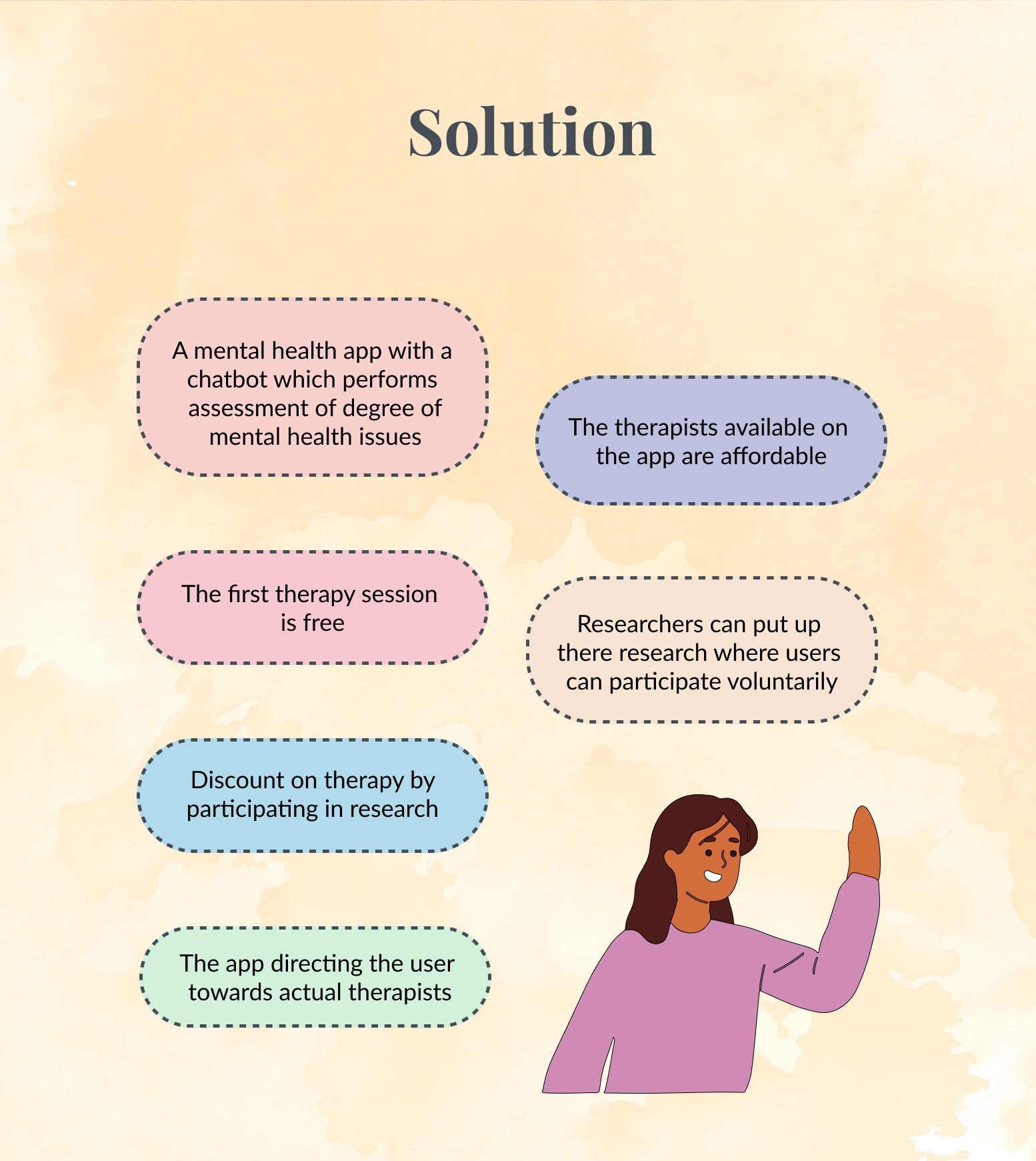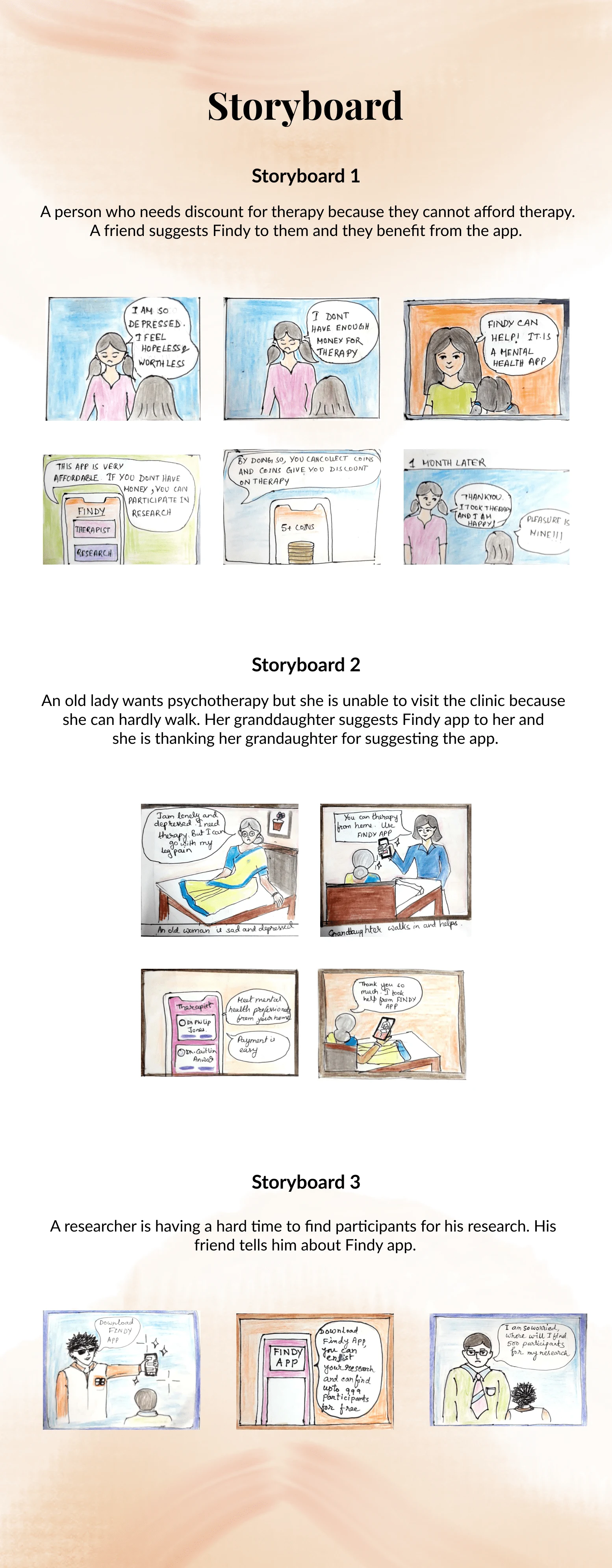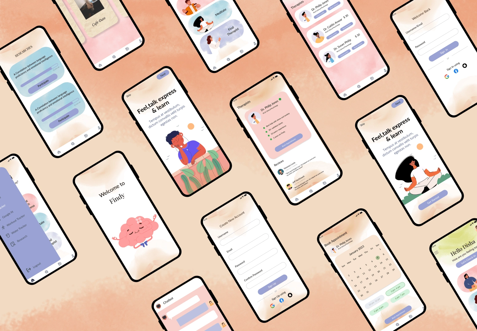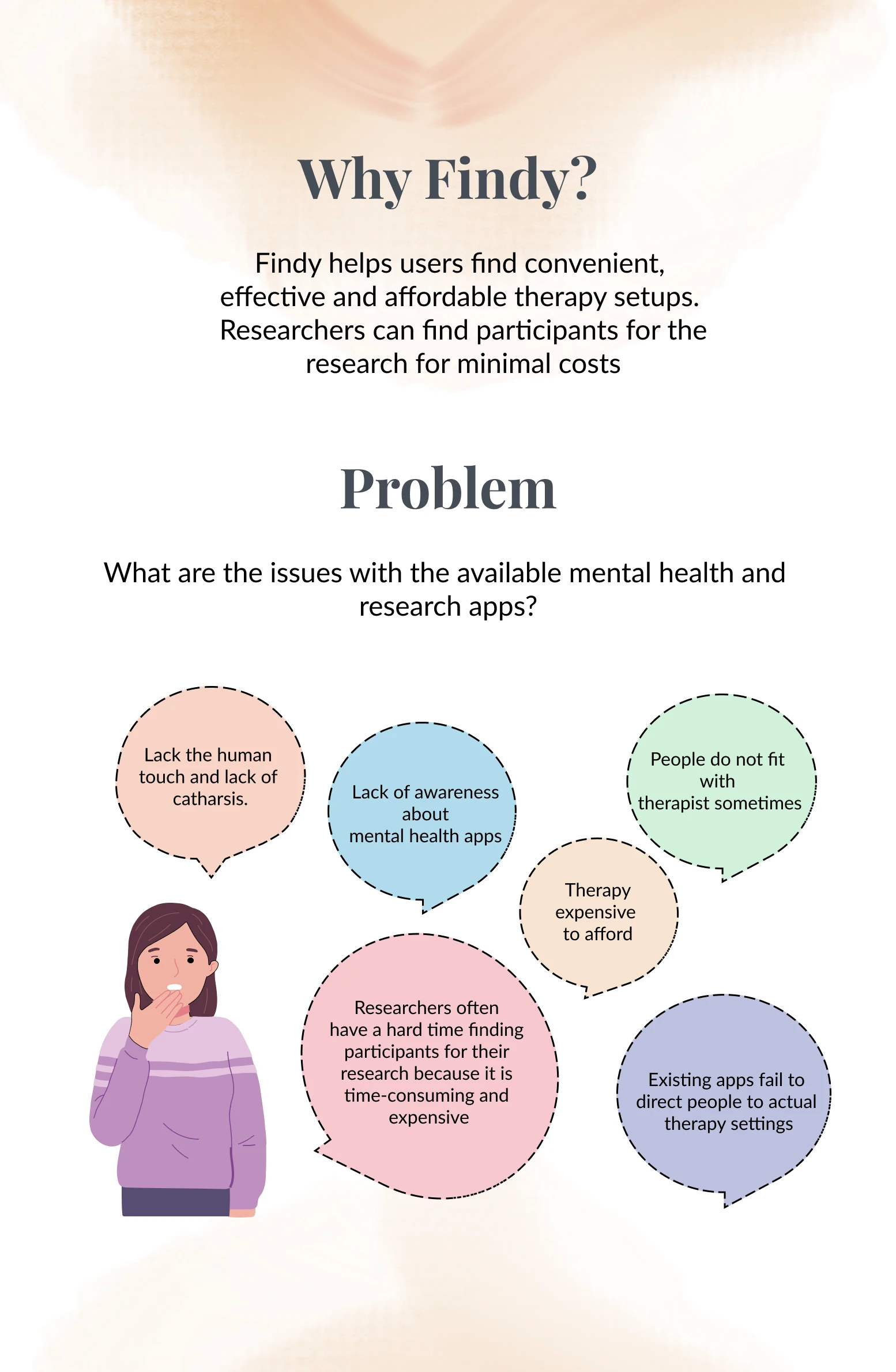 Findy is a mental health app connecting users with affordable therapy and enabling researchers to recruit participants. It offers chatbot assessments and disco