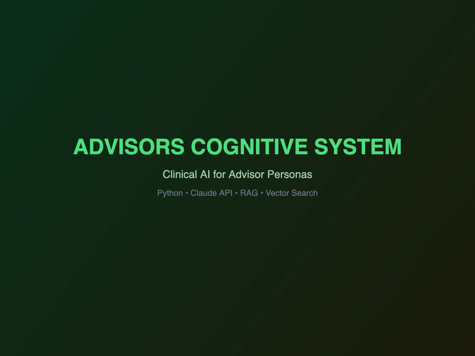 Clinical AI platform with persona-driven advisor agents. RAG retrieval, safety compliance judges, and multi-provider LLM routing.