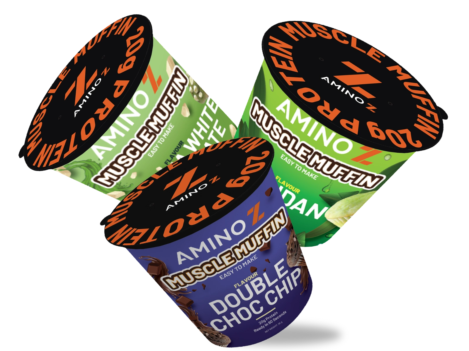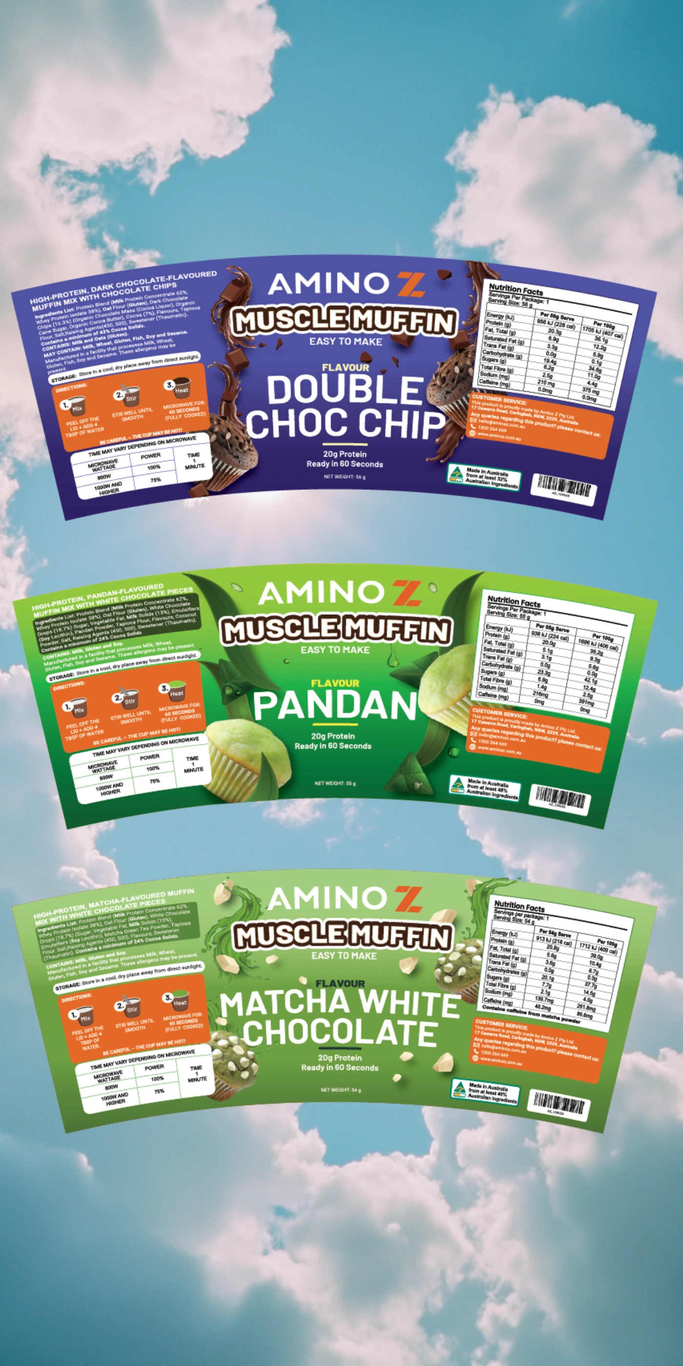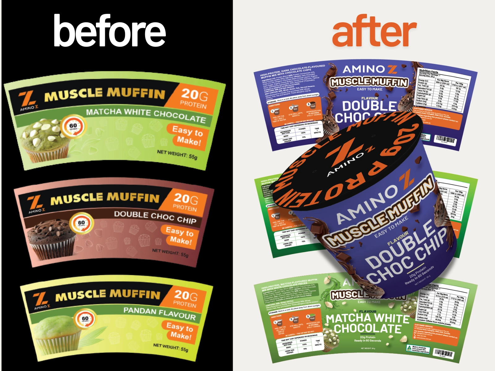 Redesigned Amino Z Muscle Muffin packaging with a modern, modular system, clear nutrition, color-coded flavors, and CMYK print-ready files.