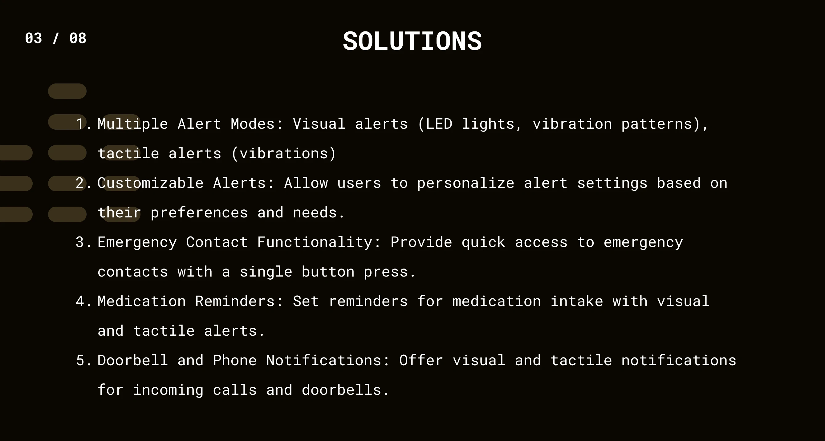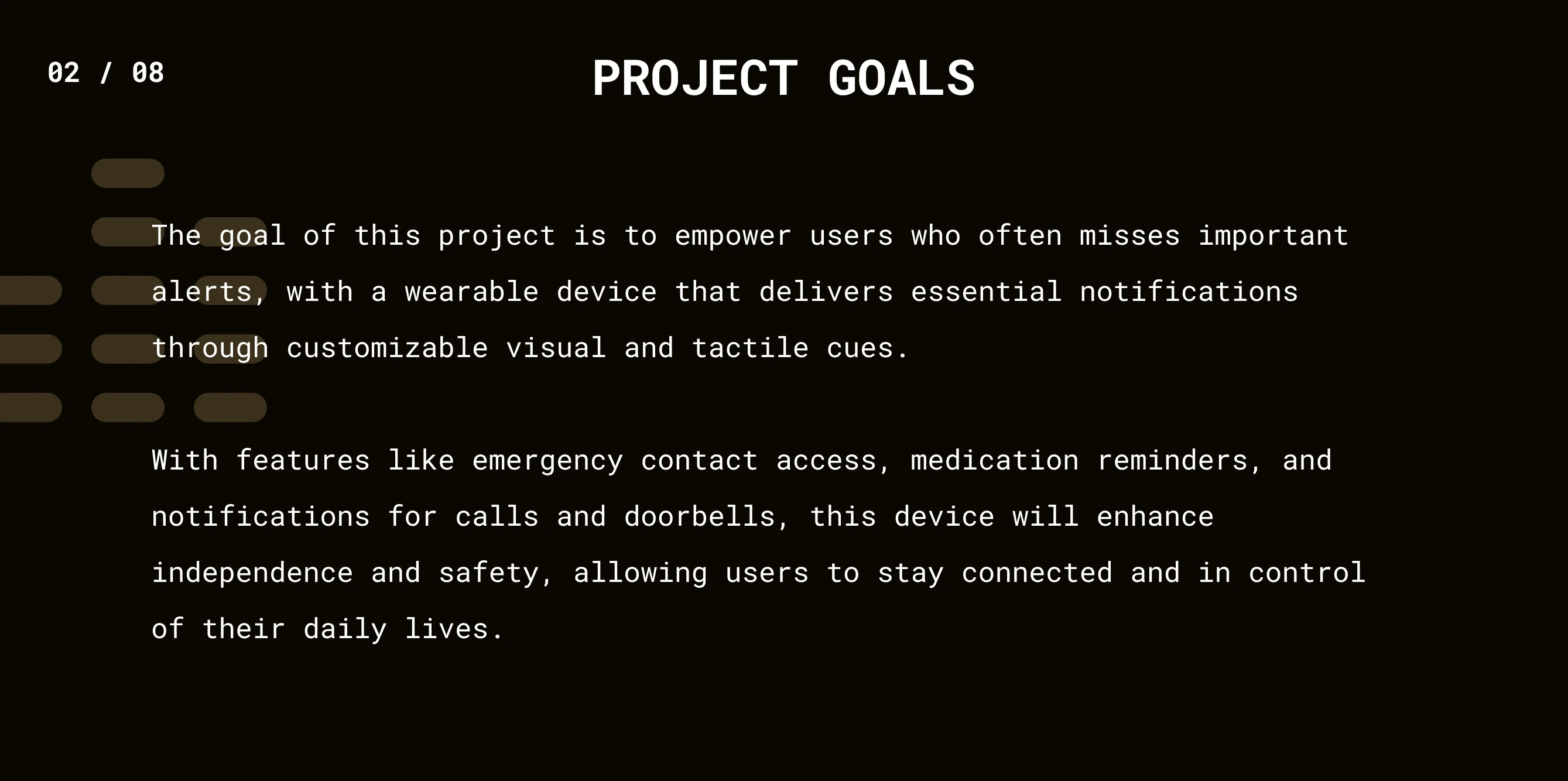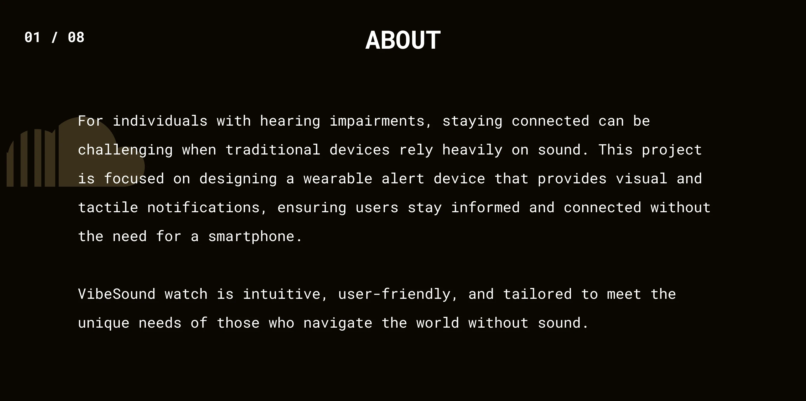 A wearable solution for individuals with hearing impairments. Focused on visual and tactile alerts, customizable notifications, and emergency contact functions.