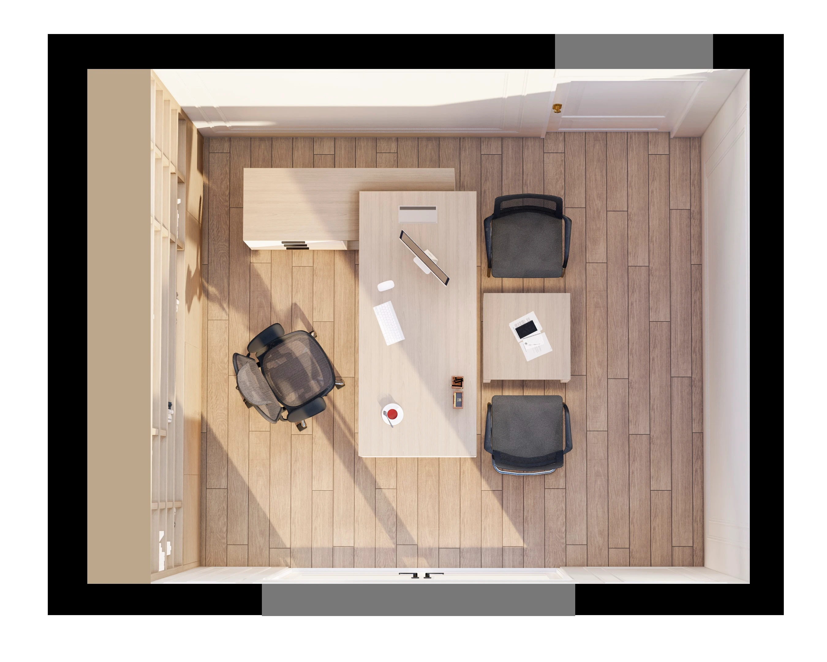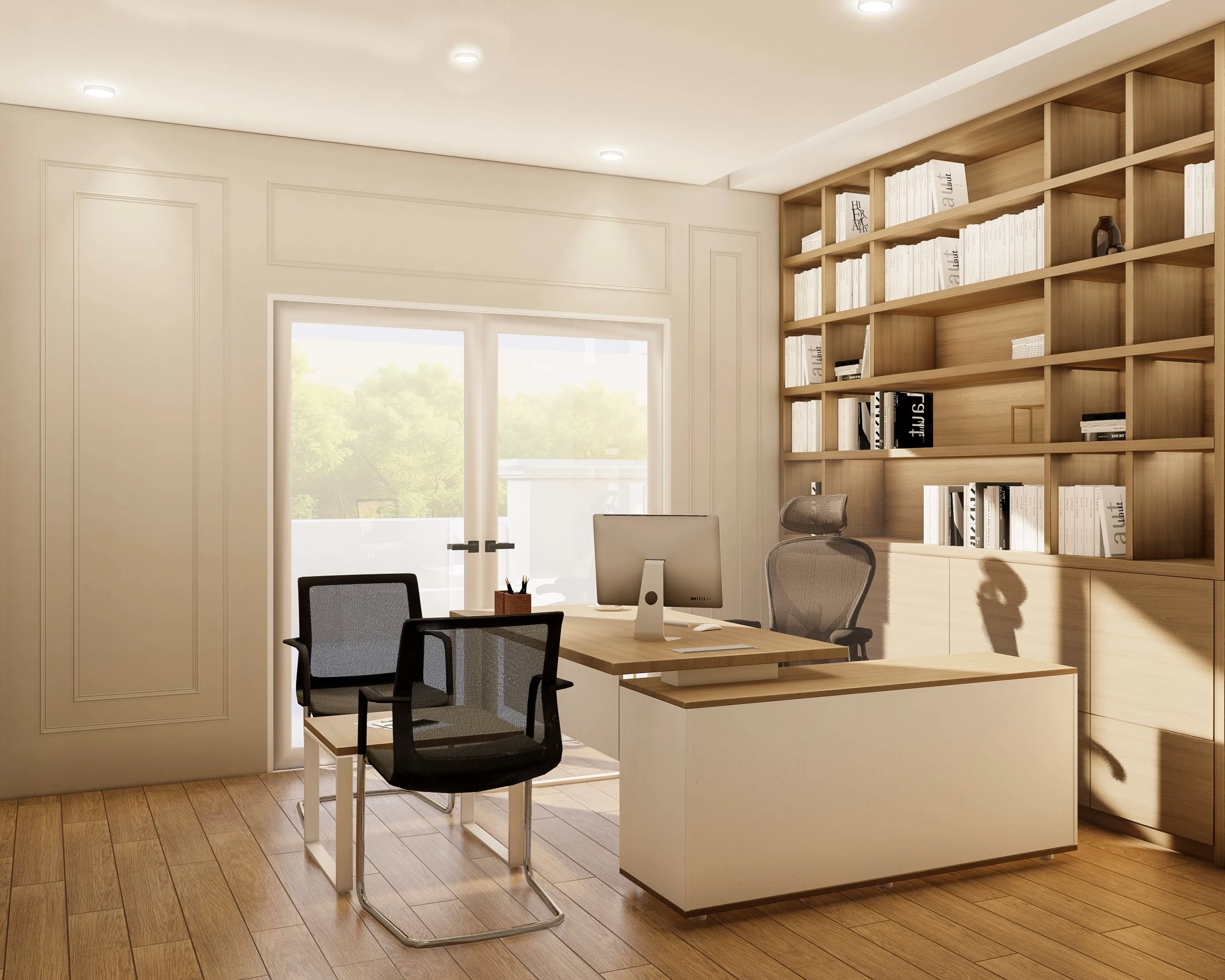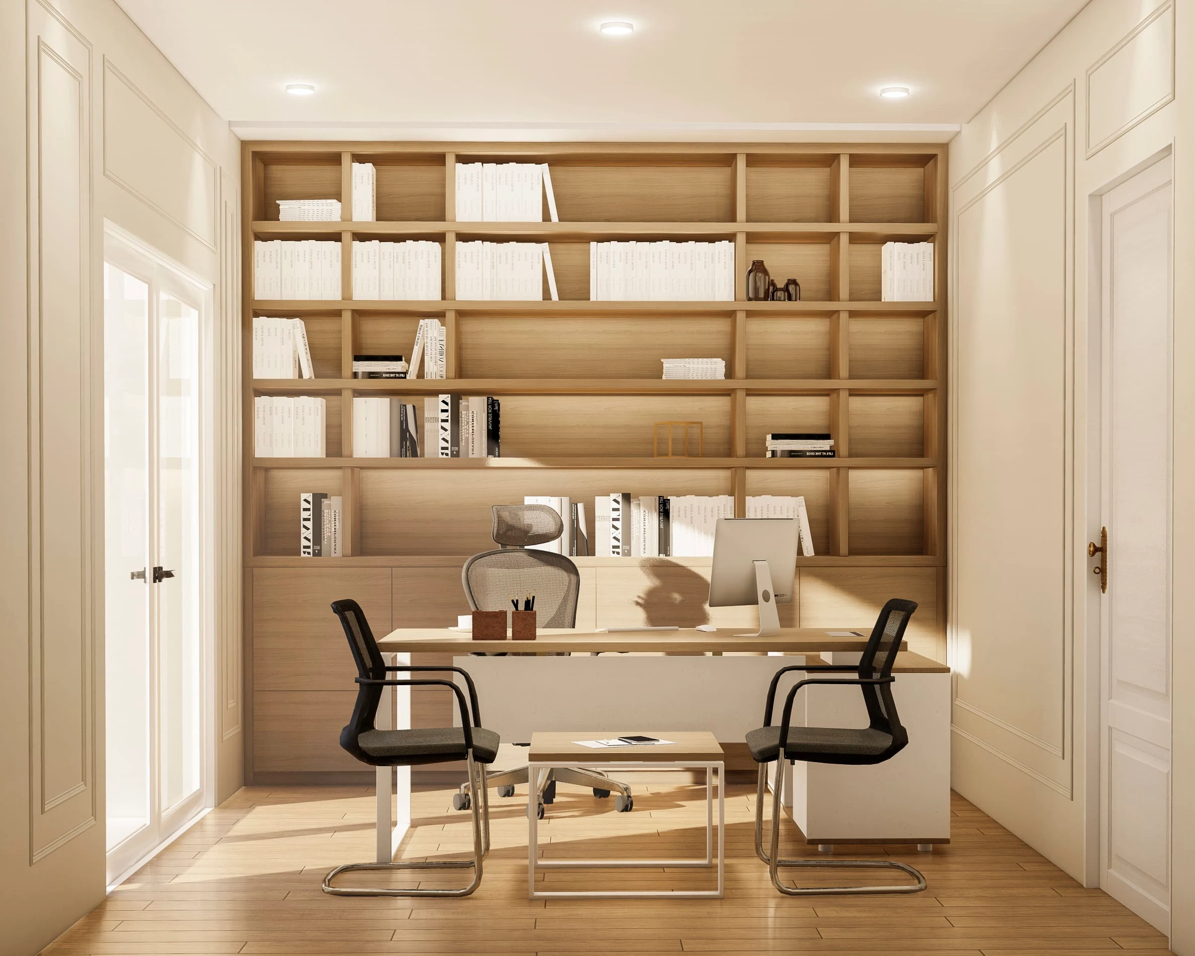 I envisioned a small home office with a custom wall cabinet for style and storage. The horizontal wood flooring and simple white walls with decorative moldings.