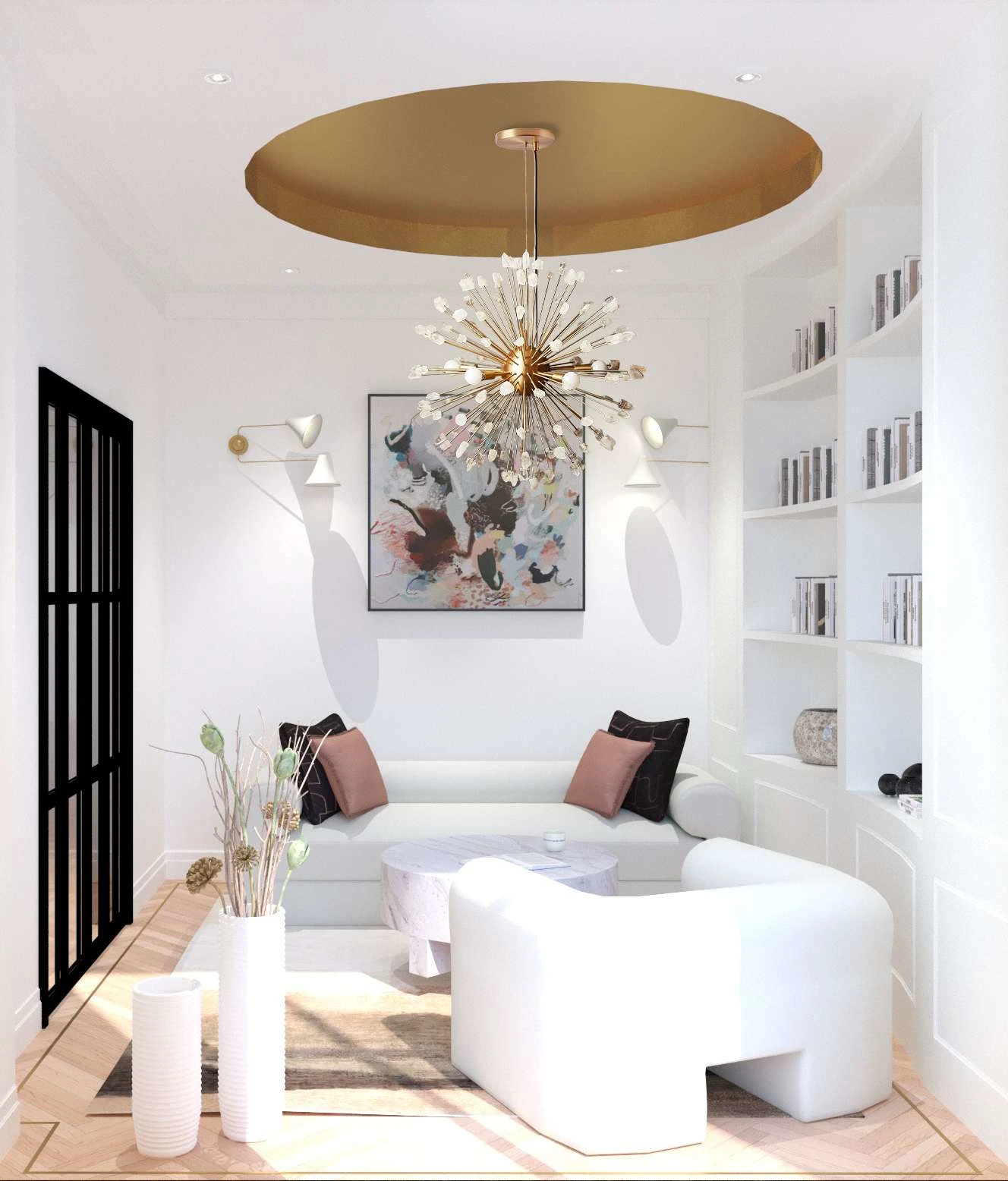 Elegant formal living room with neutral tones, curved furniture, marble accents, a striking gold chandelier, and built-in shelves for a modern, airy feel.