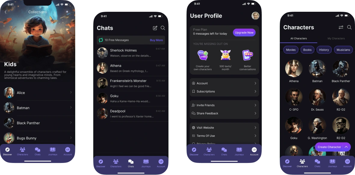 To enhance usability, we implemented a bottom navigation system that gives users quick access to key features like Discover, Characters, Journeys (story mode with characters), their personal profile, and Chats. This system ensured a fluid user experience, allowing users to easily switch between sections of the app without getting lost, making the app feel intuitive.