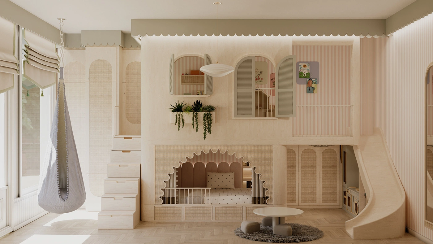 This room was designed for a 2-year-old girl, blending playfulness with comfort and functionality.