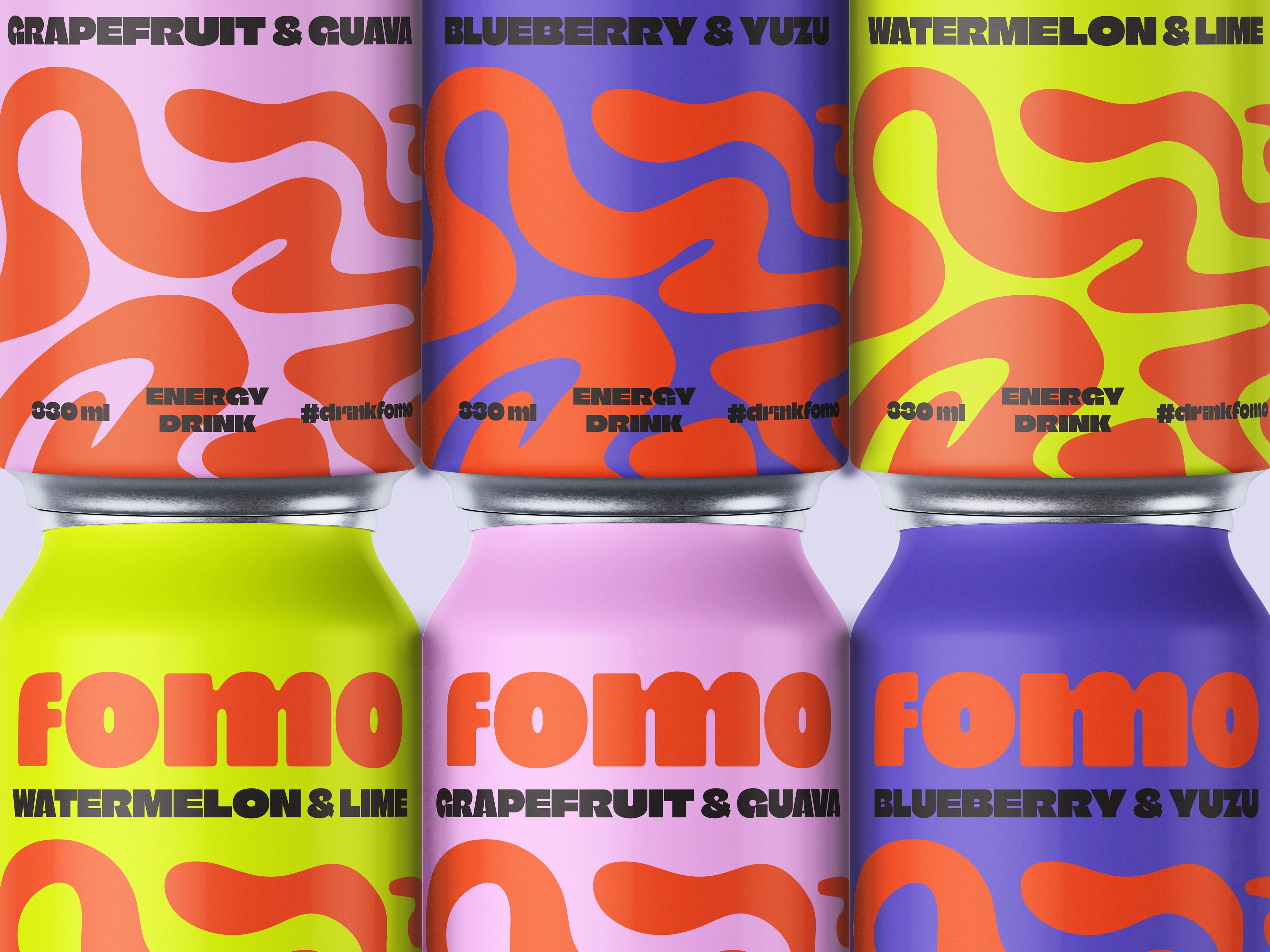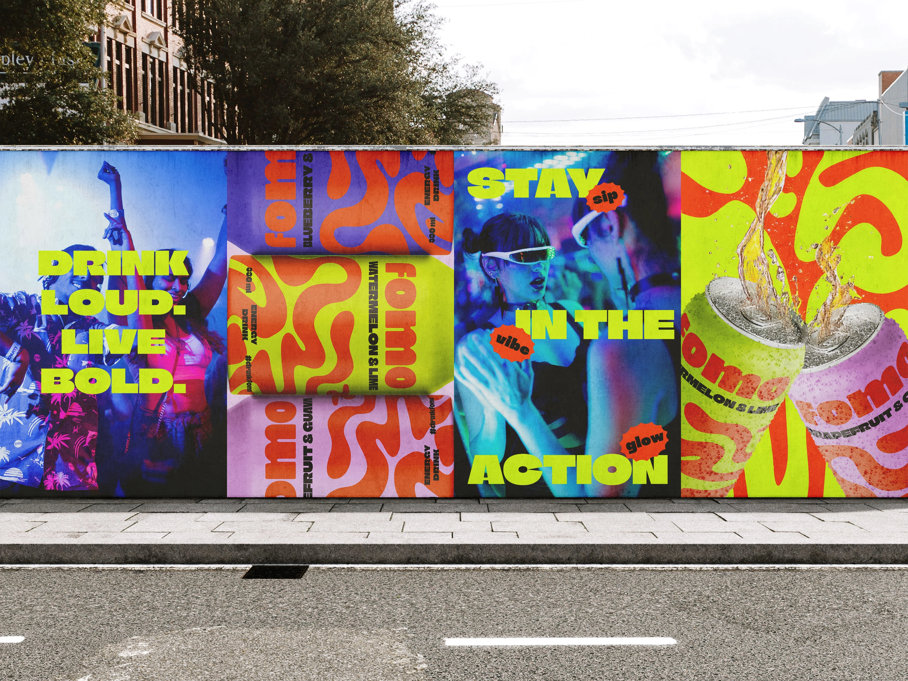 A vibrant brand identity for FOMO, a party-fueled drink created for Gen Z and young millennials who never want to miss the moment.