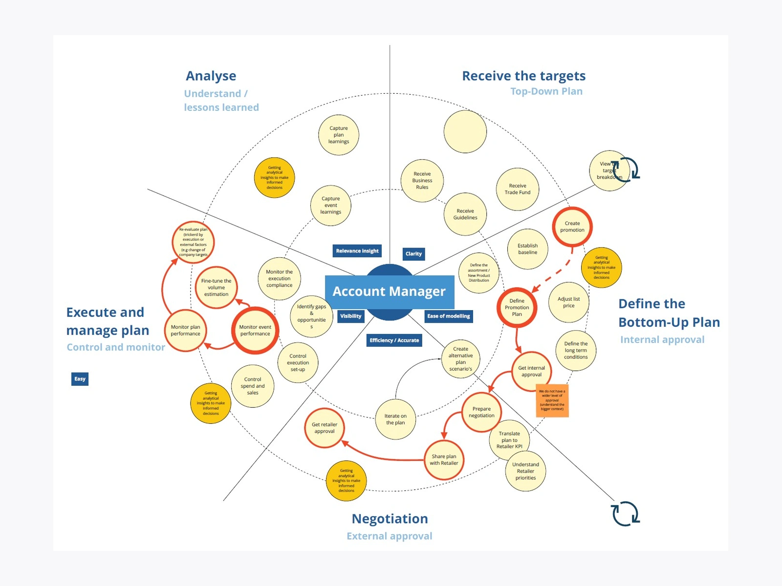 My first step was to map the entire planning lifecycle end-to-end: analysis, target reception, plan creation, scenario modelling, negotiation, execution, and post-event learning. I conducted interviews with commercial, finance, trade marketing, and supply-chain teams to understand how plans were prepared, validated, adjusted, and executed in real markets. This revealed a large number of hidden tasks, offline workarounds, and approval gates that were not reflected in the existing product.