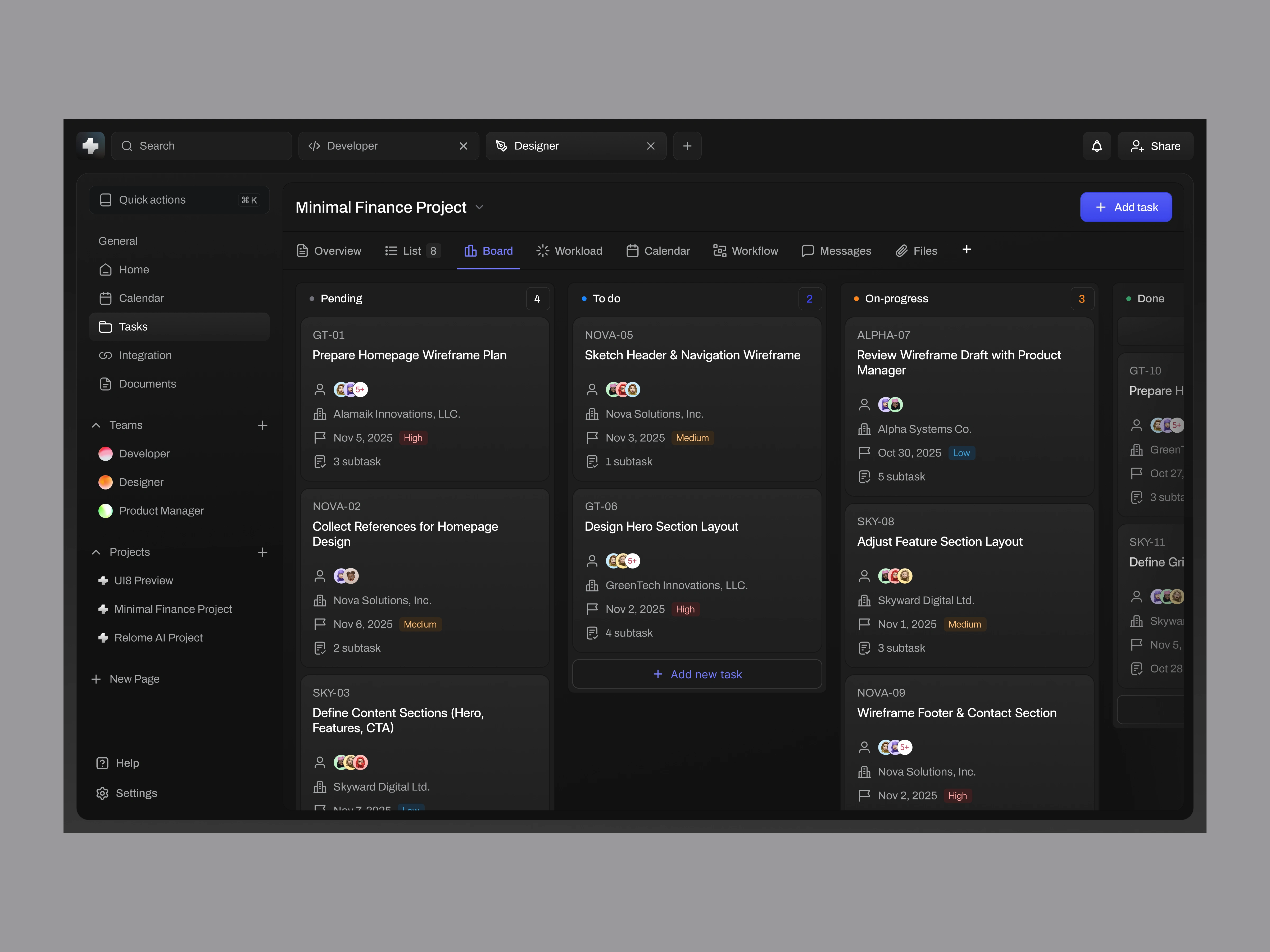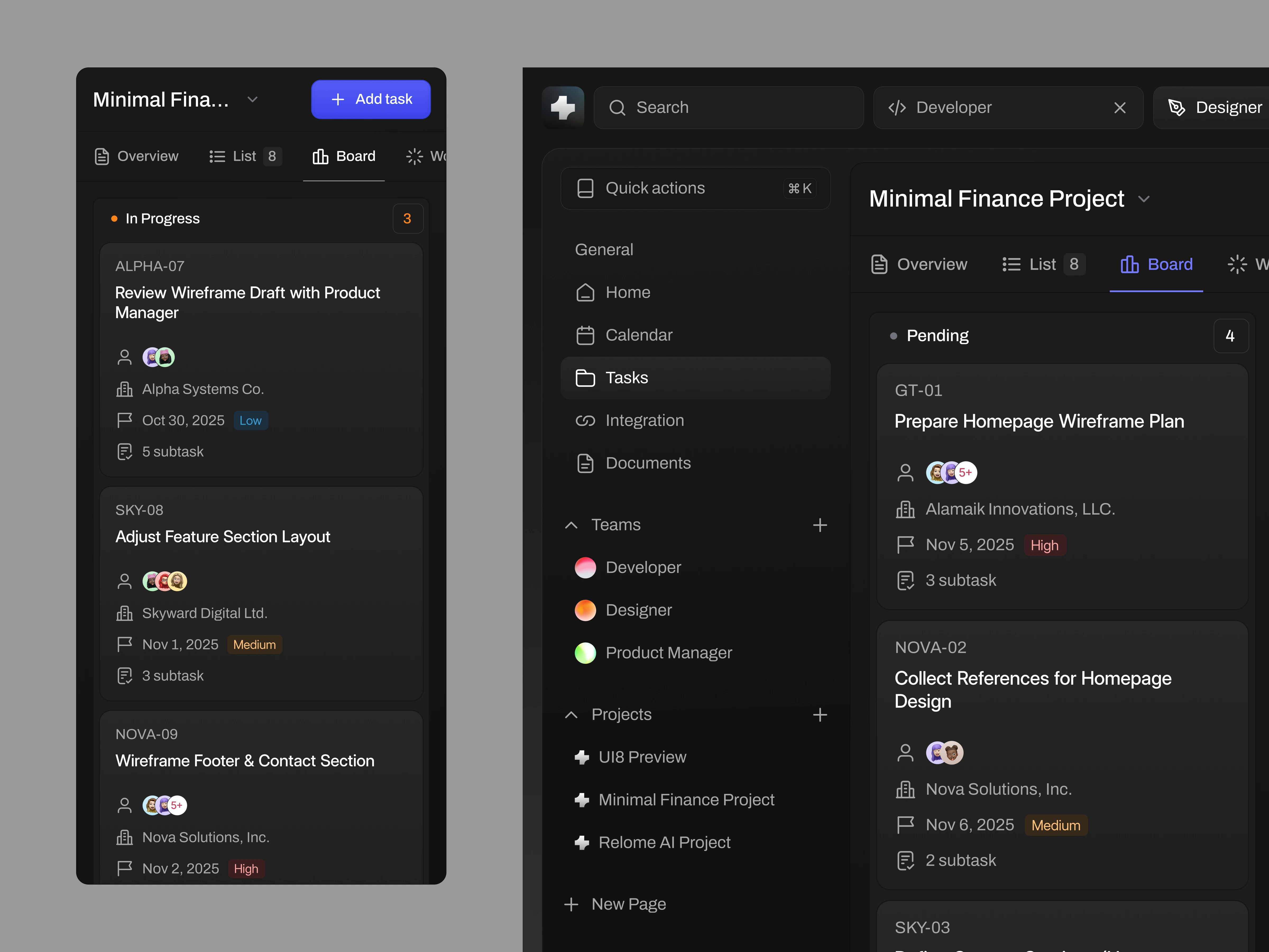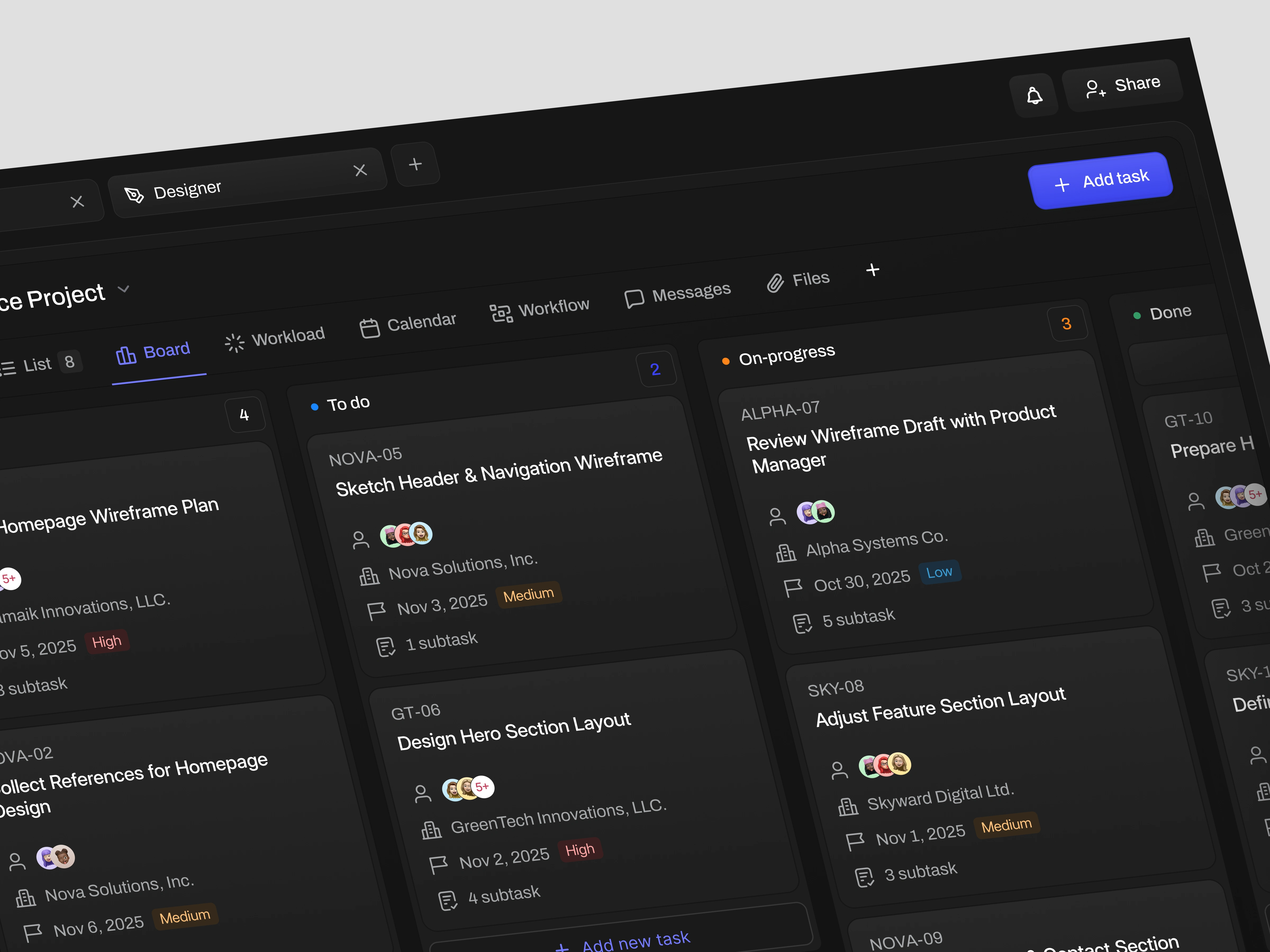 This redesigned dashboard places transparency and speed at the core of its user experience. Each task card now serves as a micro-dashboard displaying priority level, company/team name, due date, and subtask count upfront. With this improved structure, users can quickly scan, prioritize, and act without diving into unnecessary layers of detail. The goal: a frictionless task overview that saves time while keeping productivity high.