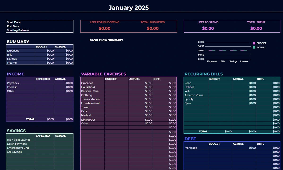 Clean, intuitive budget template for tracking income, expenses, and savings—built to make personal finance simple.