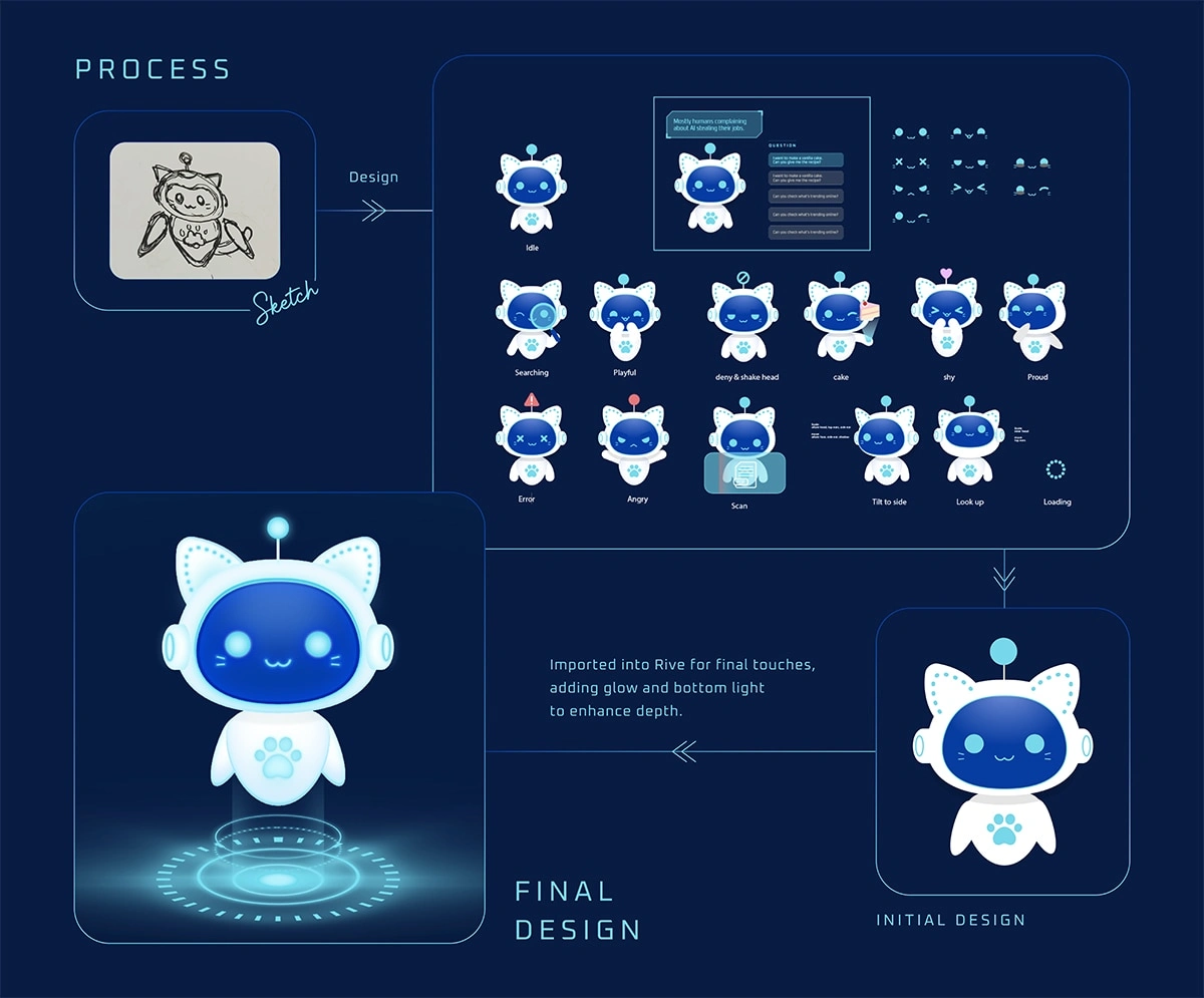 I designed and animated an AI robot with cursor tracking and five interactive prompts, each with its own animation.