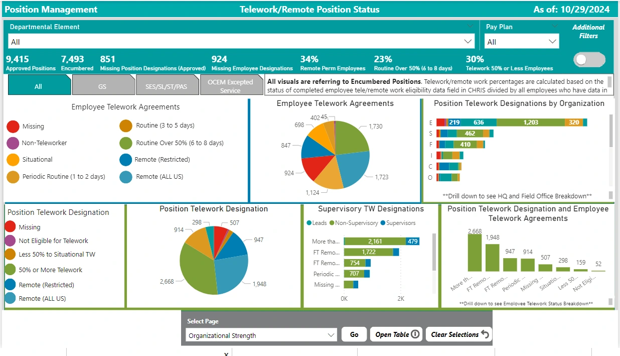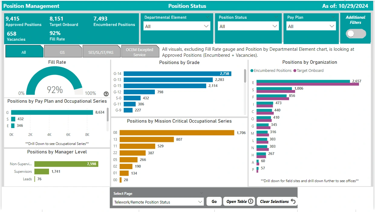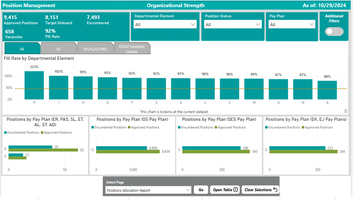 Dashboard tracking approved, filled, and open positions by organizations and manager level, built to help clients analyze fill rates across their workforce.