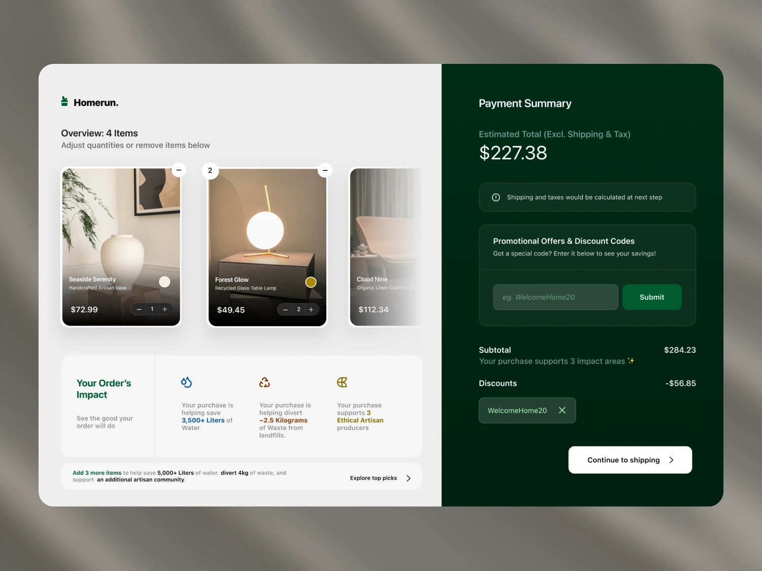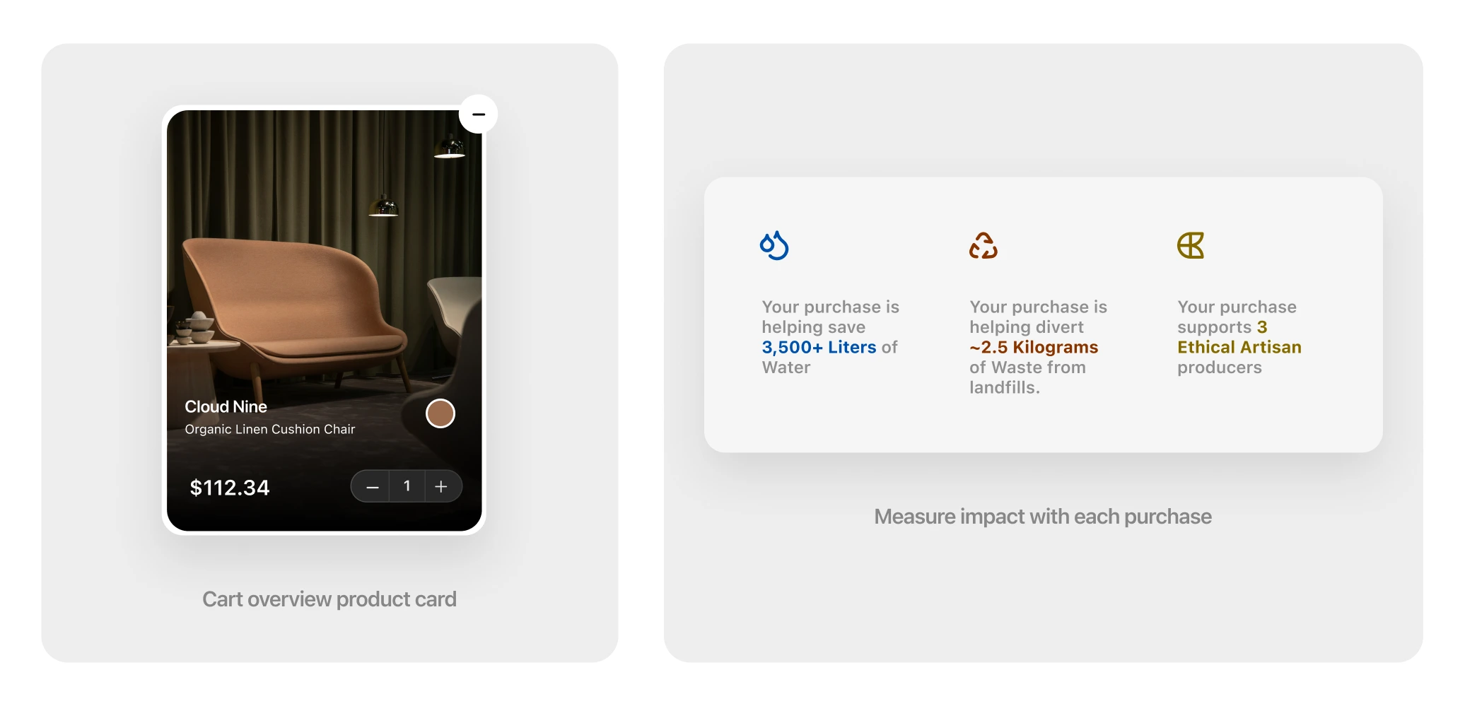 Examine each product card to confirm your selection, quantity, and price. Simultaneously, view the impact card to understand the positive environmental and social difference your entire order makes.