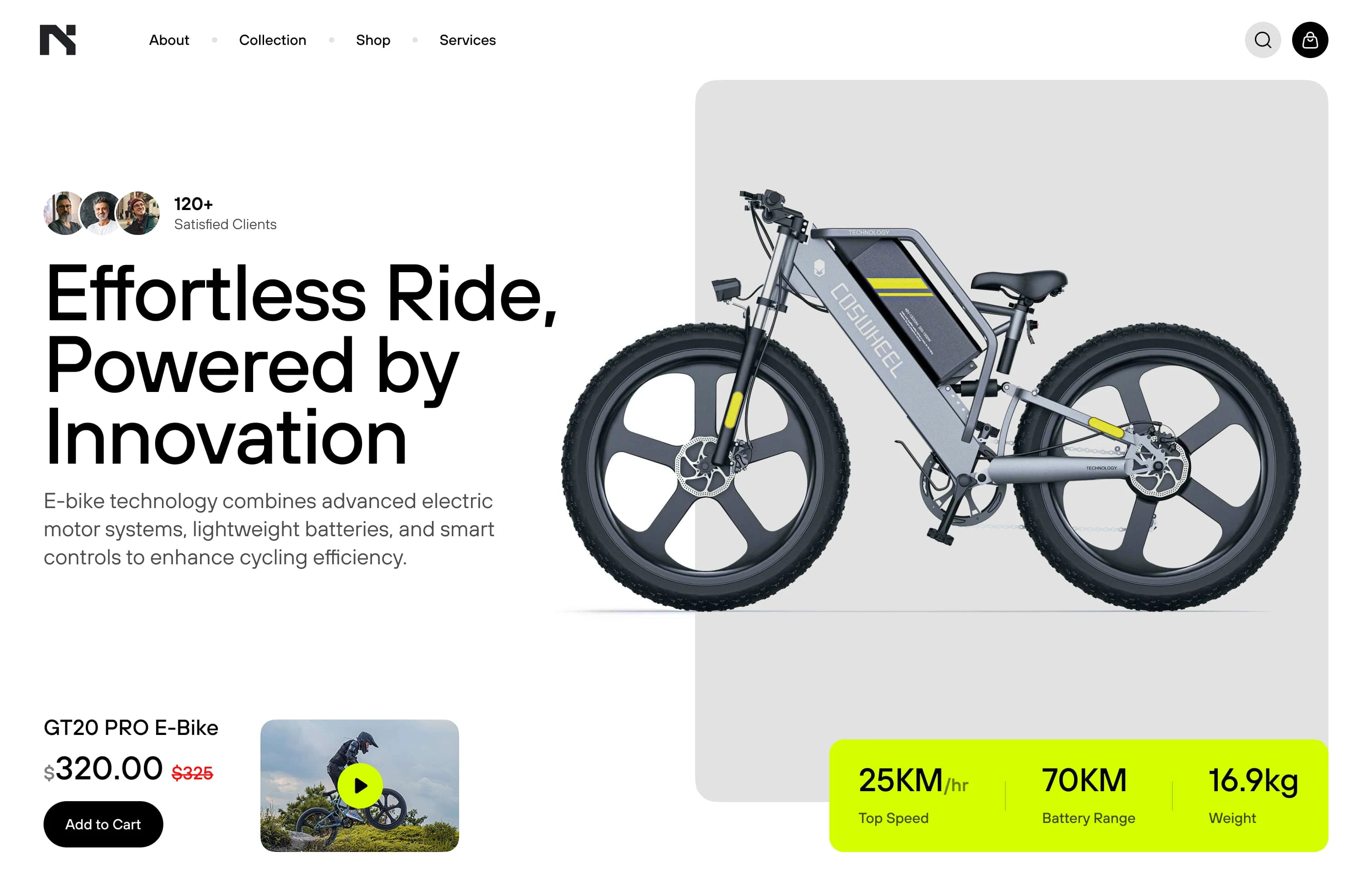 This e-commerce website design for e-bikes offers a clean, intuitive, and visually appealing user experience. The minimalist UI creates a spacious layout, while bold typography ensures readability. Bright call-to-action buttons and strong contrast between black, white, and neon yellow guide users effortlessly. The site highlights key features like detailed e-bike specs, pricing, discounts, video previews, and smooth navigation, all optimized for mobile. With trust indicators like customer reviews and product specifications, it blends style and functionality for a seamless shopping experience.