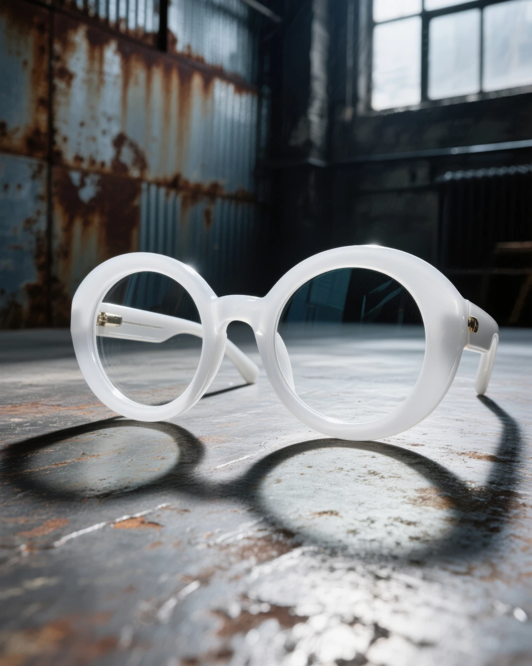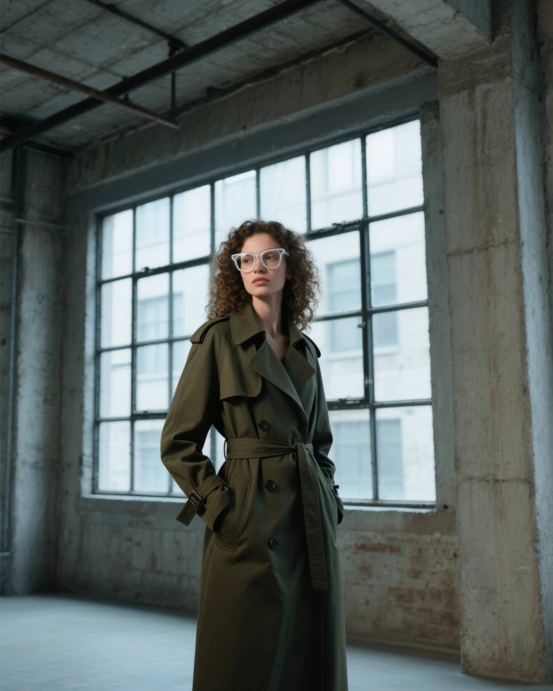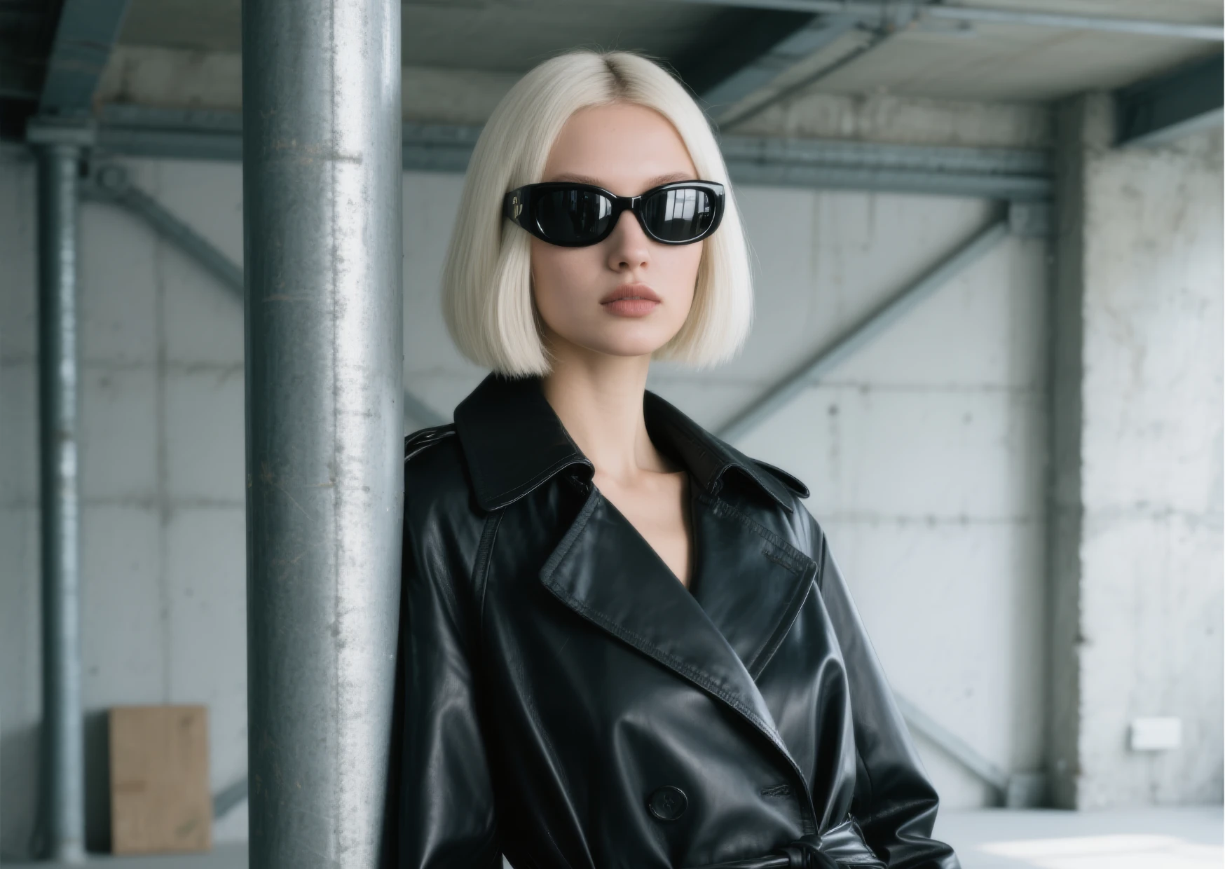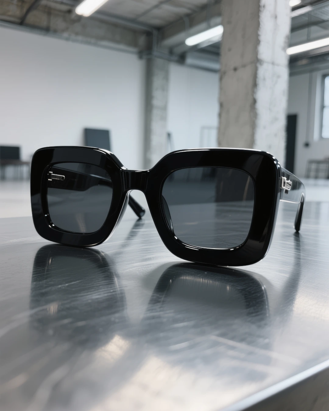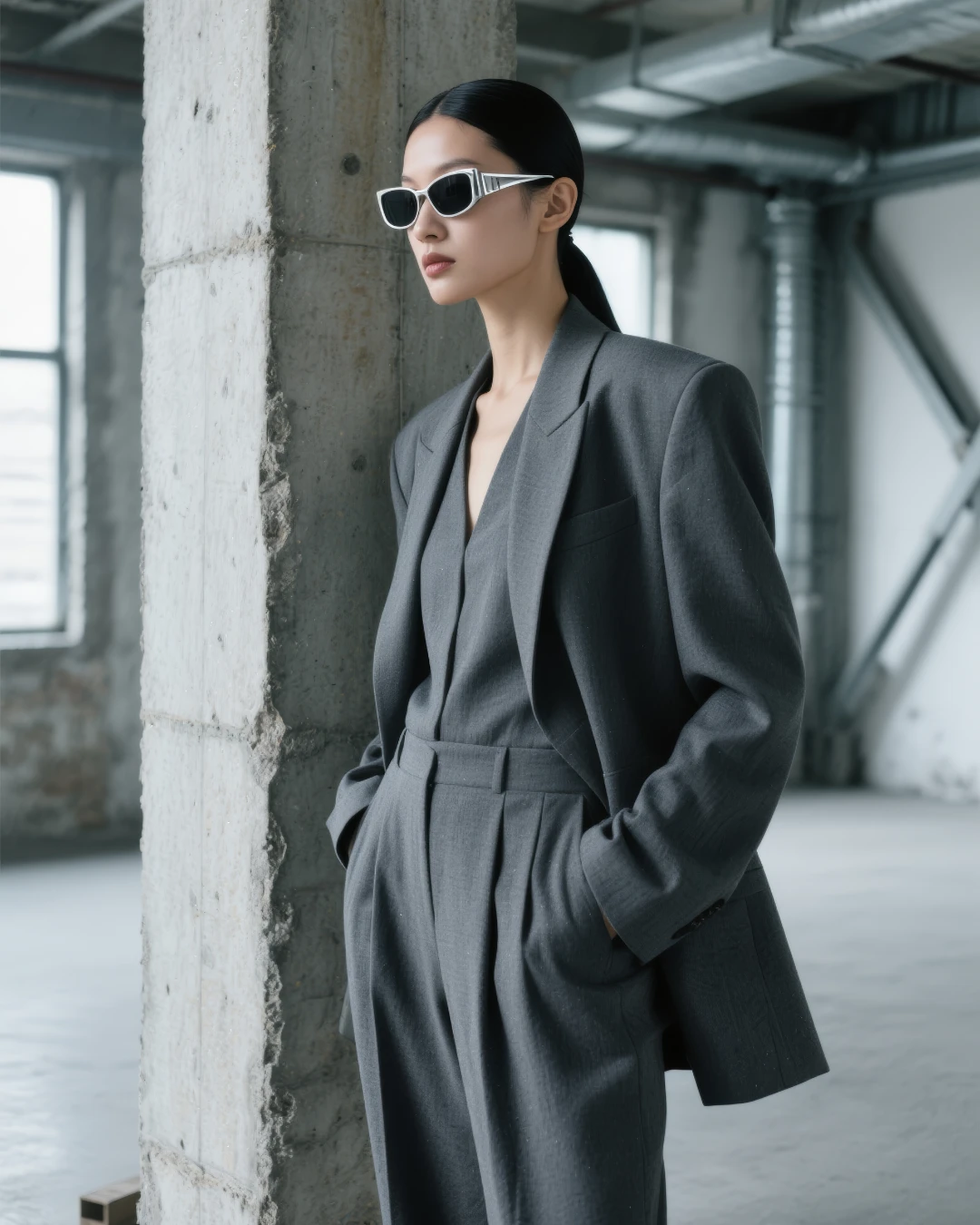 Each frame is presented both as an object of design and as part of a complete look — styled with trench coats, tailored suits, and leather pieces to emphasize sophistication and attitude. The close-up shots of the glasses elevate them as sculptural pieces, while portraits of models bring a sense of presence and character.