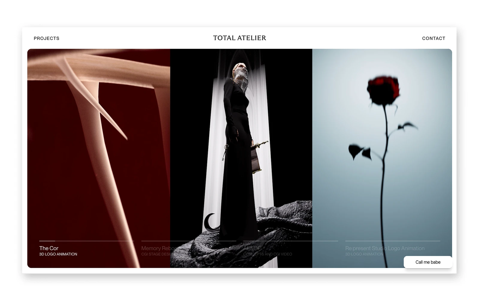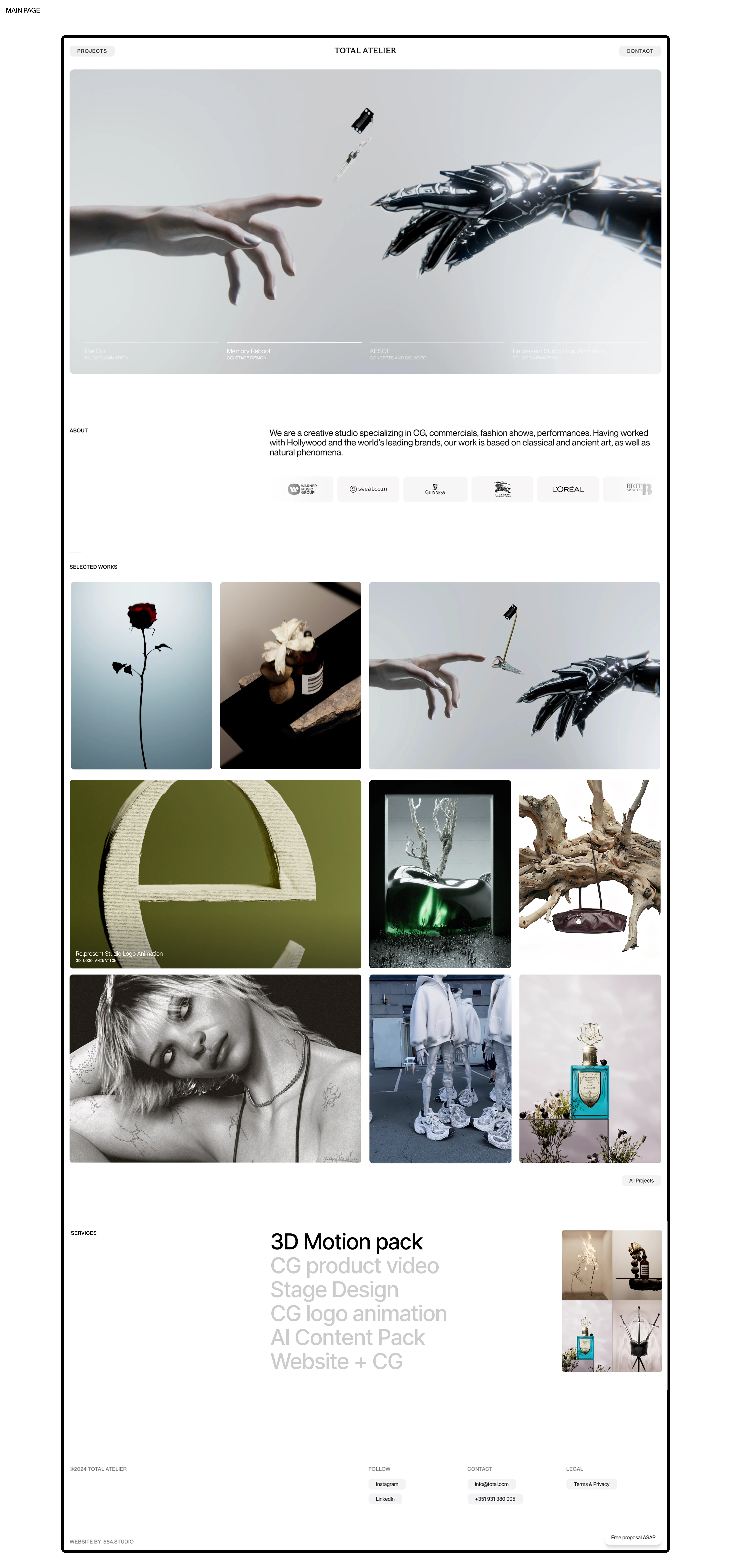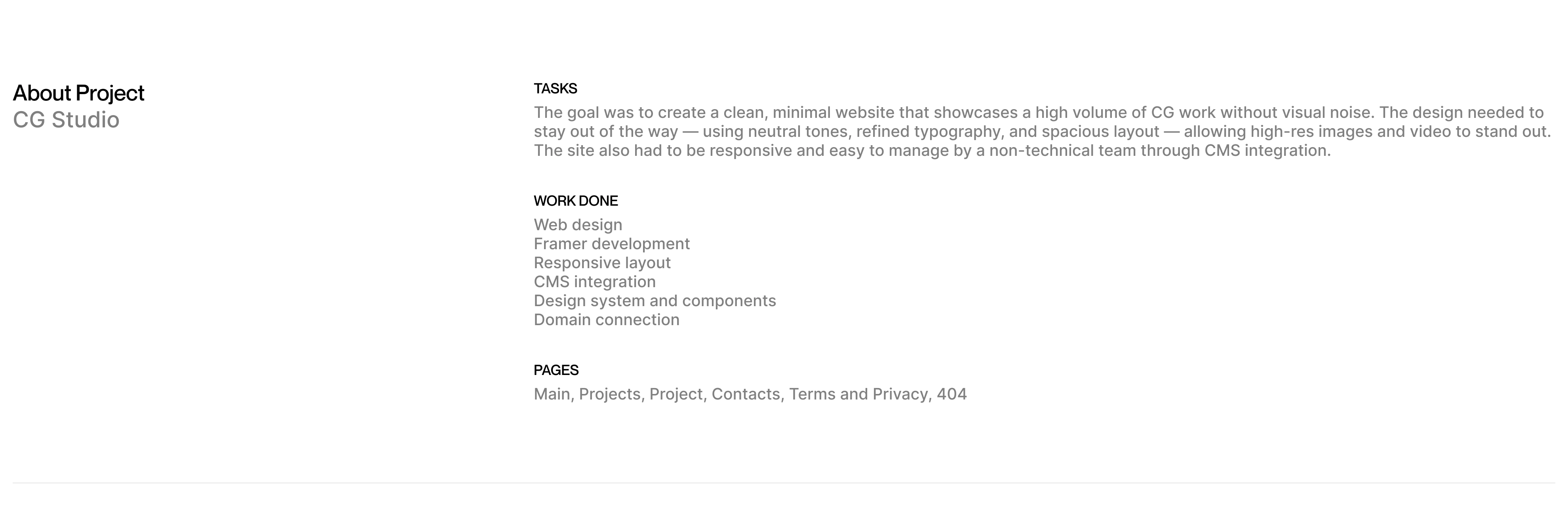 A portfolio website for CG3D Studio with custom pages: Home, Project, Projects, About, and Contacts.