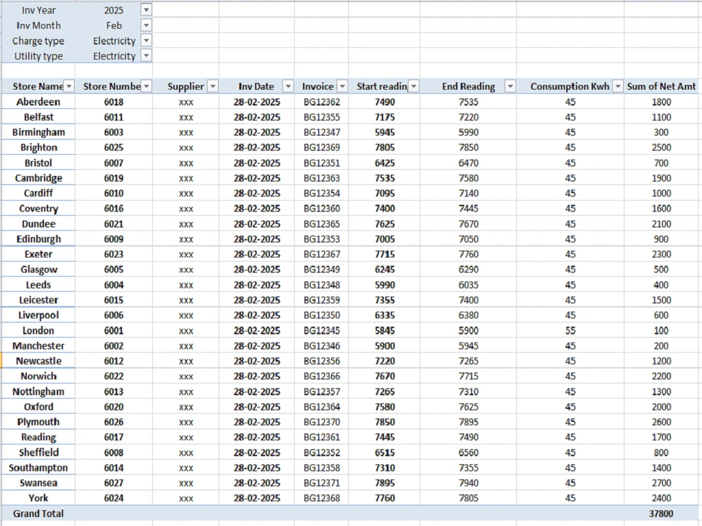 Electricity, Gas and Water Utility Tracker preparation for multiple stores in UK, for billing by suppliers after matching Billed Readings with Actual readings