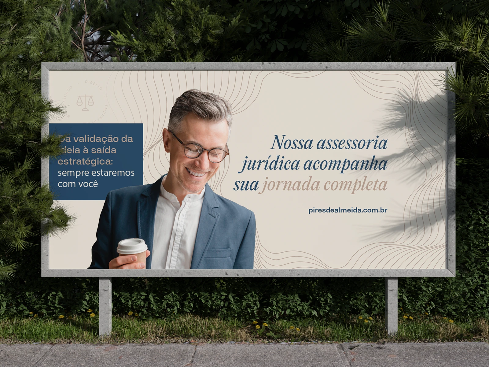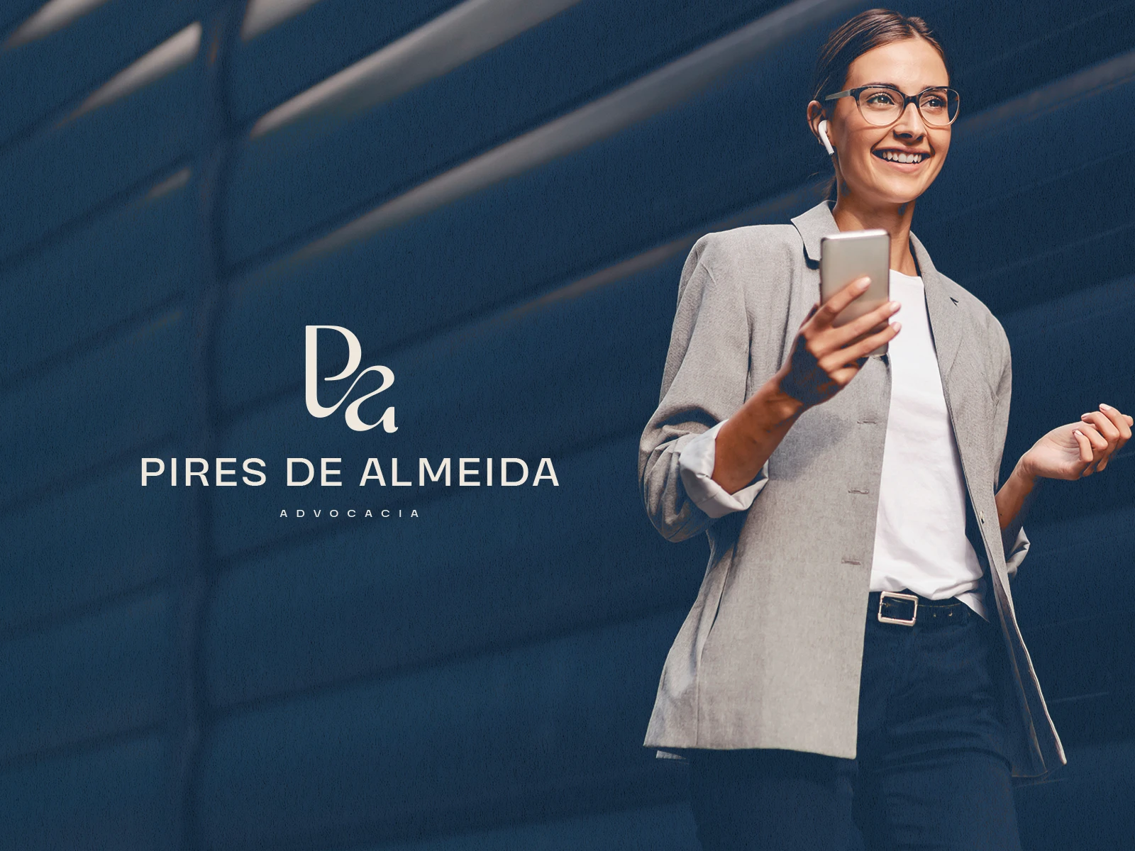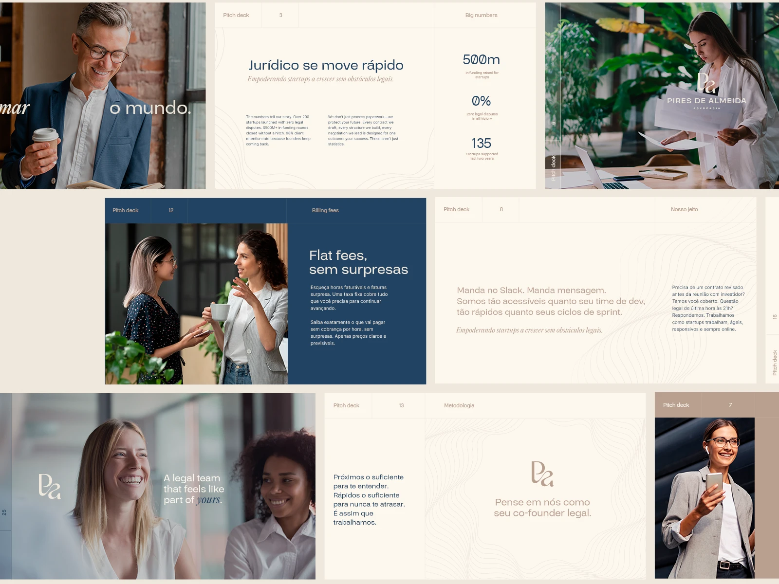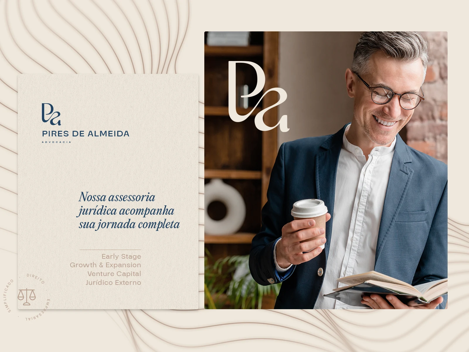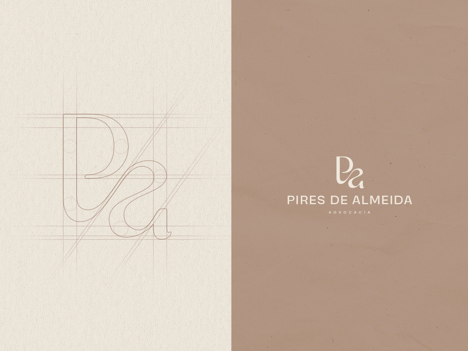 Buscamos criar um sistema visual que respira. O monograma nasceu de formas fluidas — um "P" e um "a" que se entrelaçam com leveza, fugindo da rigidez geométrica do universo jurídico. A tipografia mescla serifadas e bastonadas, equilibrando credibilidade com estilo contemporâneo. Paleta neutra e terrosa, texturas orgânicas, fotografia com pessoas reais em ambientes informais — nada posado, só o cotidiano de quem constrói junto.